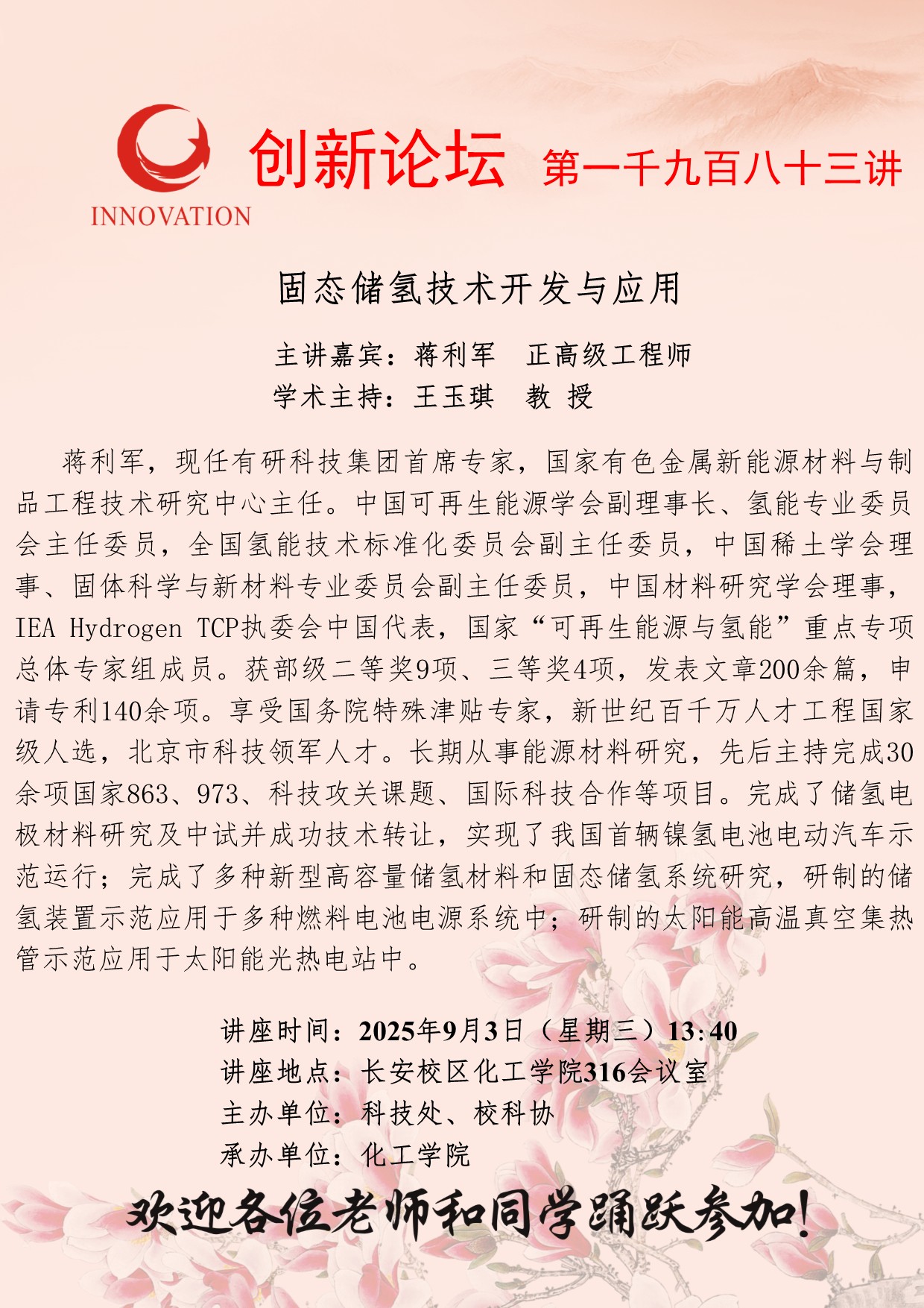 蒋利军 正高级工程师 伟德国际1946源于英国创新论坛第一千九百八十三讲:固态储氢技术开发与应用 讲座时间 2025年9月3日(星期三)13:40 讲座地点 长安校区化工学院316会议室 讲座人介绍 蒋利军 正高级工程师 讲座内容