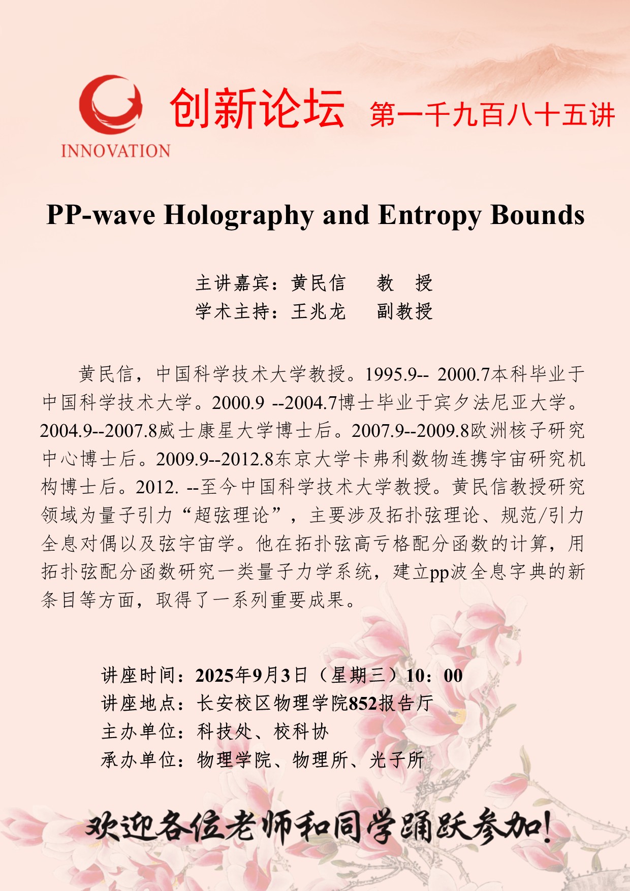 黄民信 教授 伟德国际1946源于英国创新论坛第一千九百八十五讲:PP-wave Holography and Entropy Bounds 讲座时间 2025年9月3日(星期三)10:00 讲座地点 长安校区物理学院852报告厅 讲座人介绍 黄民信 教授 讲座内容
