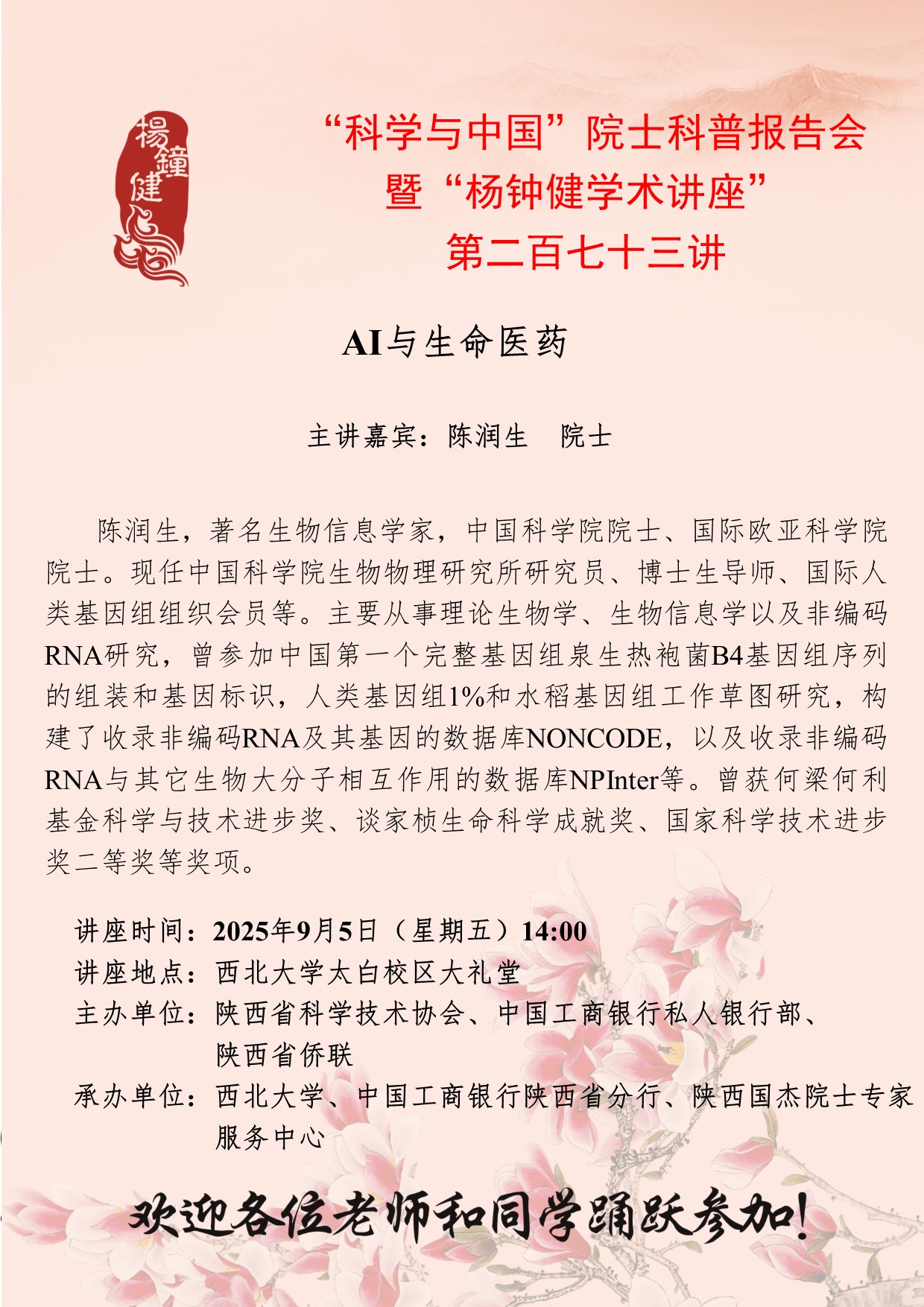陈润生 院士 “科学与中国”院士科普报告会暨“杨钟健学术讲座”第二百七十三讲:AI与生命医药 讲座时间 2025年9月5日(星期五)14:00 讲座地点 伟德国际1946源于英国太白校区大礼堂 讲座人介绍 陈润生 院士 讲座内容