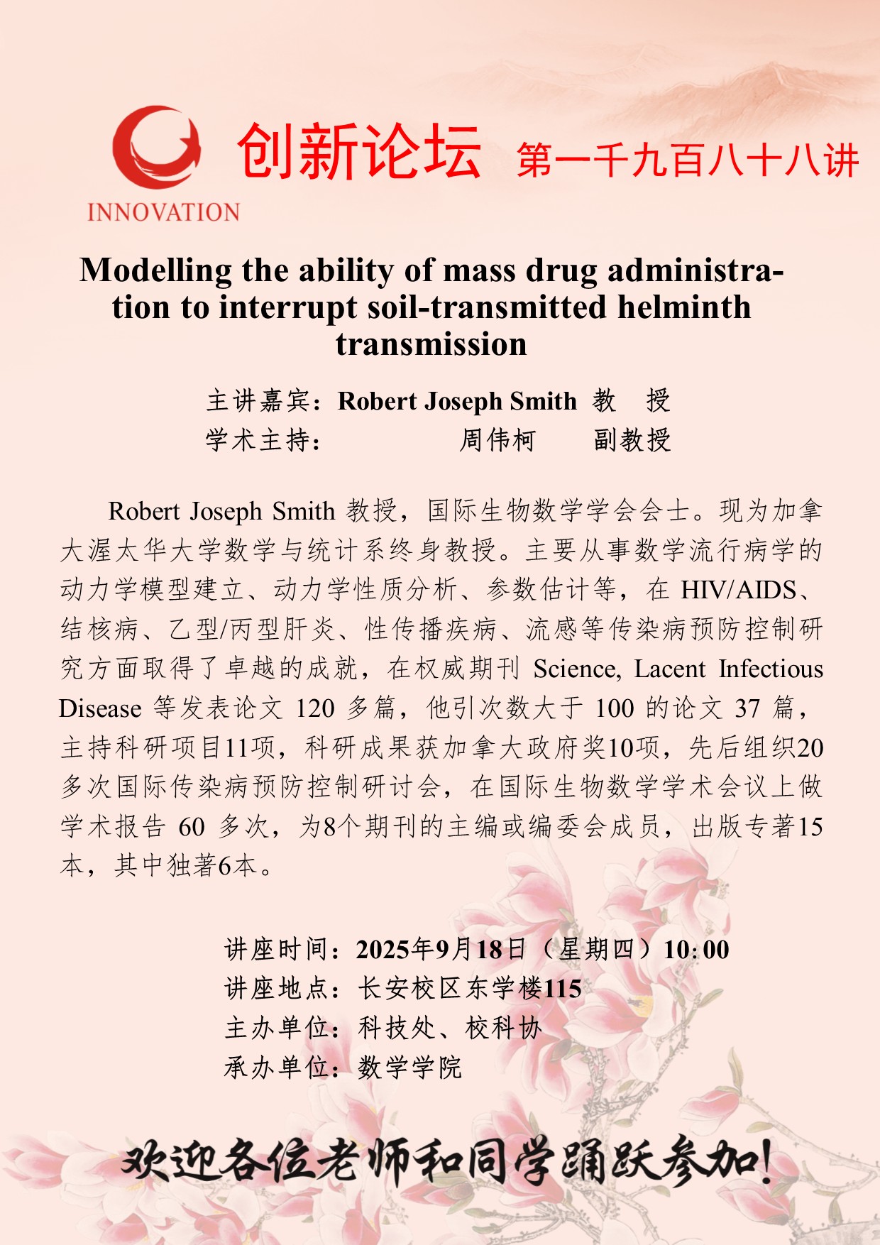 Robert Joseph Smith 教授 伟德国际1946源于英国创新论坛第一千九百八十八讲:Modelling the ability of mass drug administration to interrupt soil-transmitted helminth transmission 讲座时间 2025年9月18日(星期四)10:00 讲座地点 长安校区东学楼115 讲座人介绍 Robert Joseph Smith 教授 讲座内容