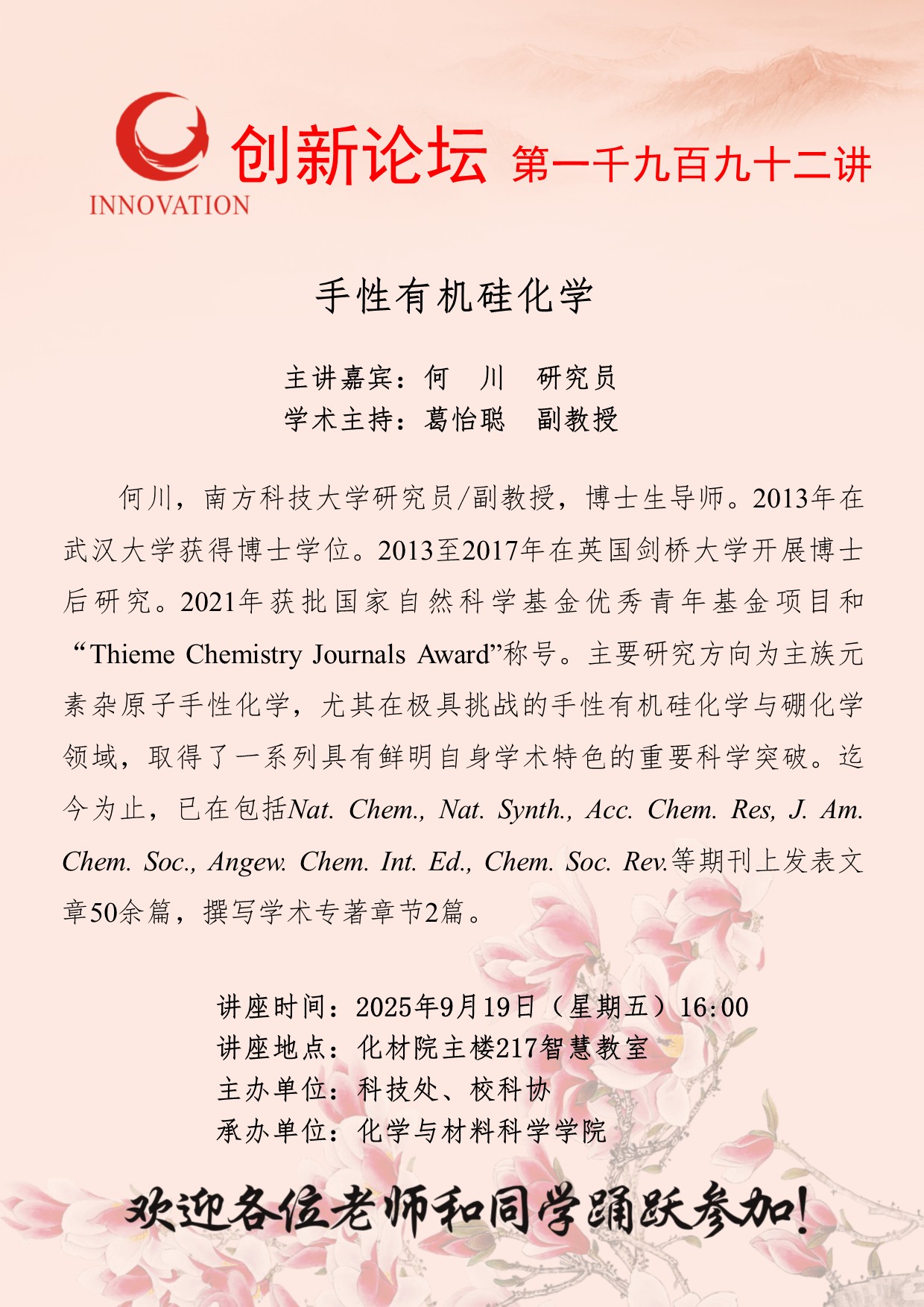 何川 研究员 伟德国际1946源于英国创新论坛第一千九百九十二讲:手性有机硅化学 讲座时间 2025年9月19日(星期五)16:00 讲座地点 化材院主楼217智慧教室 讲座人介绍 何川 研究员 讲座内容