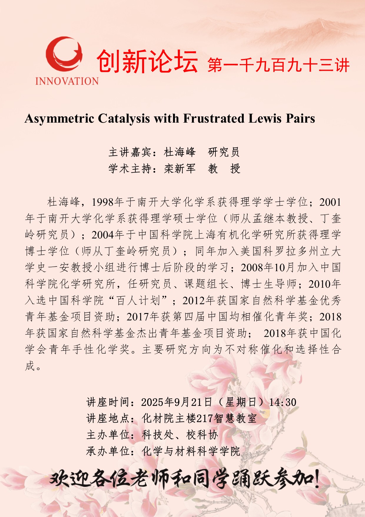 杜海峰 研究员 伟德国际1946源于英国创新论坛第一千九百九十三讲:Asymmetric Catalysis with Frustrated Lewis Pairs 讲座时间 2025年9月21日(星期日)14:30 讲座地点 化材院主楼217智慧教室 讲座人介绍 杜海峰 研究员 讲座内容