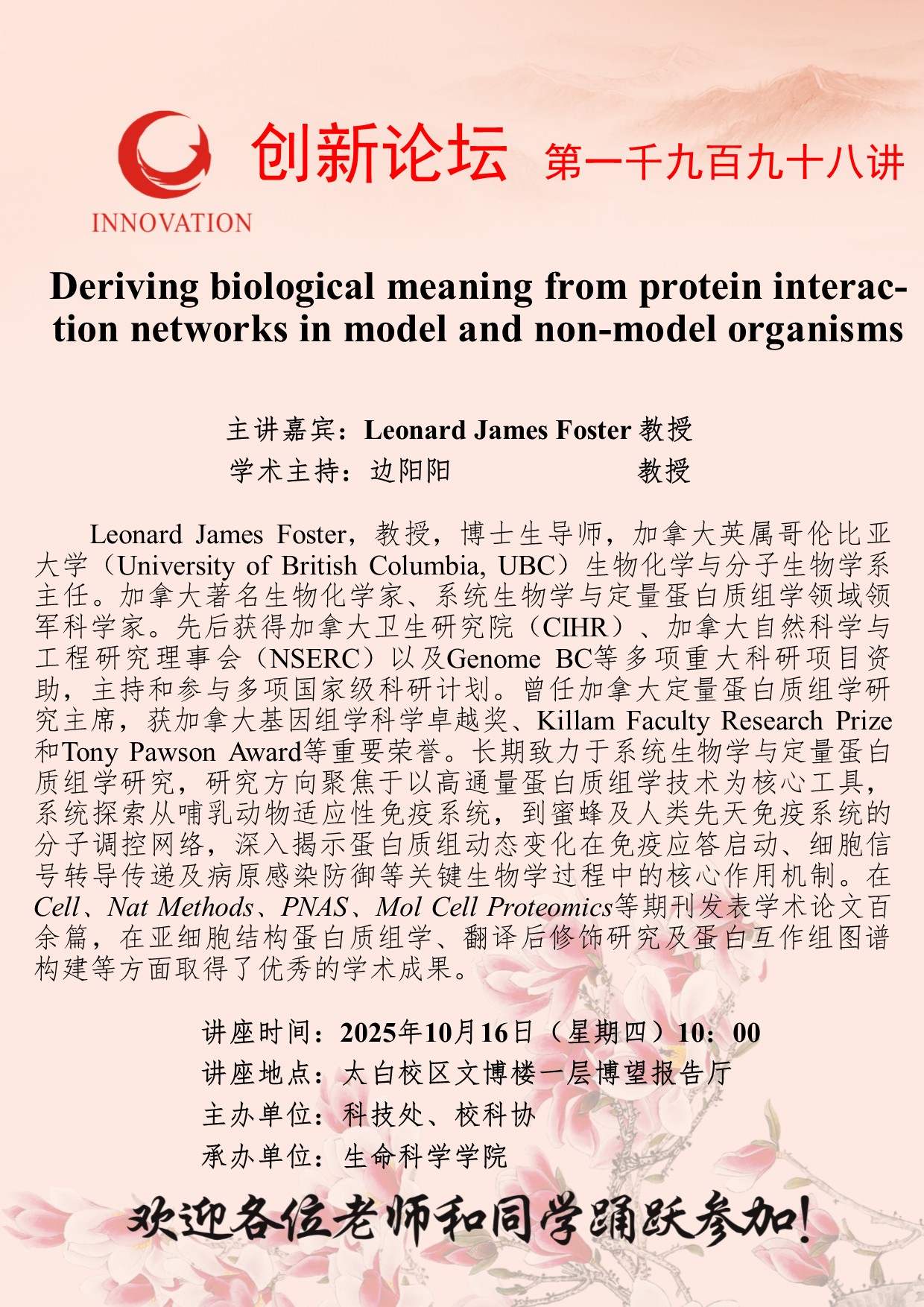 Leonard James Foster 教授 伟德国际1946源于英国创新论坛第一千九百九十八讲:Deriving biological meaning from protein interaction networks in model and non-model organisms 讲座时间 2025年10月16日(星期四)10:00 讲座地点 太白校区文博楼一层博望报告厅 讲座人介绍 Leonard James Foster 教授 讲座内容