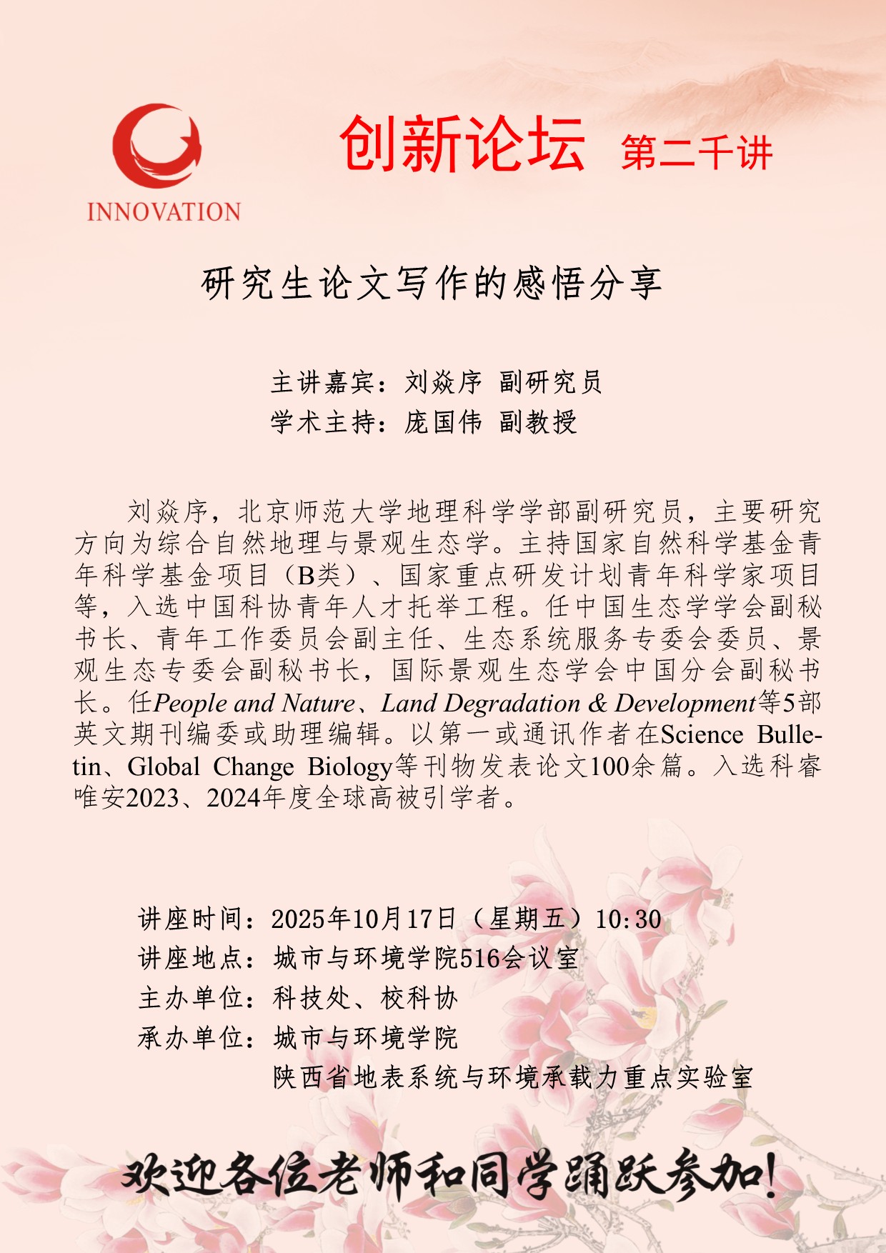 刘焱序 副研究员 伟德国际1946源于英国创新论坛第二千讲:研究生论文写作的感悟分享 讲座时间 2025年10月17日(星期五)10:30 讲座地点 城市与环境学院516会议室 讲座人介绍 刘焱序 副研究员 讲座内容