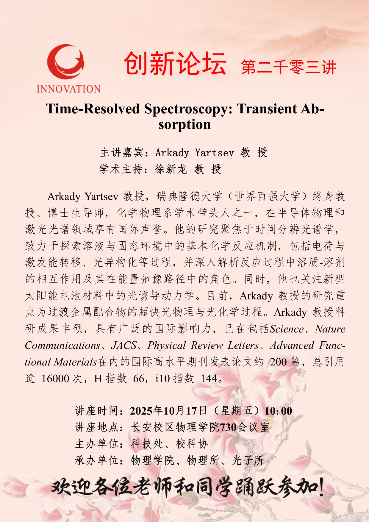 Arkady Yartsev 教授 伟德国际1946源于英国创新论坛第二千零三讲:Time-Resolved Spectroscopy: Transient Absorption 讲座时间 2025年10月17日(星期五)10:00 讲座地点 长安校区物理学院730会议室 讲座人介绍 Arkady Yartsev 教授 讲座内容