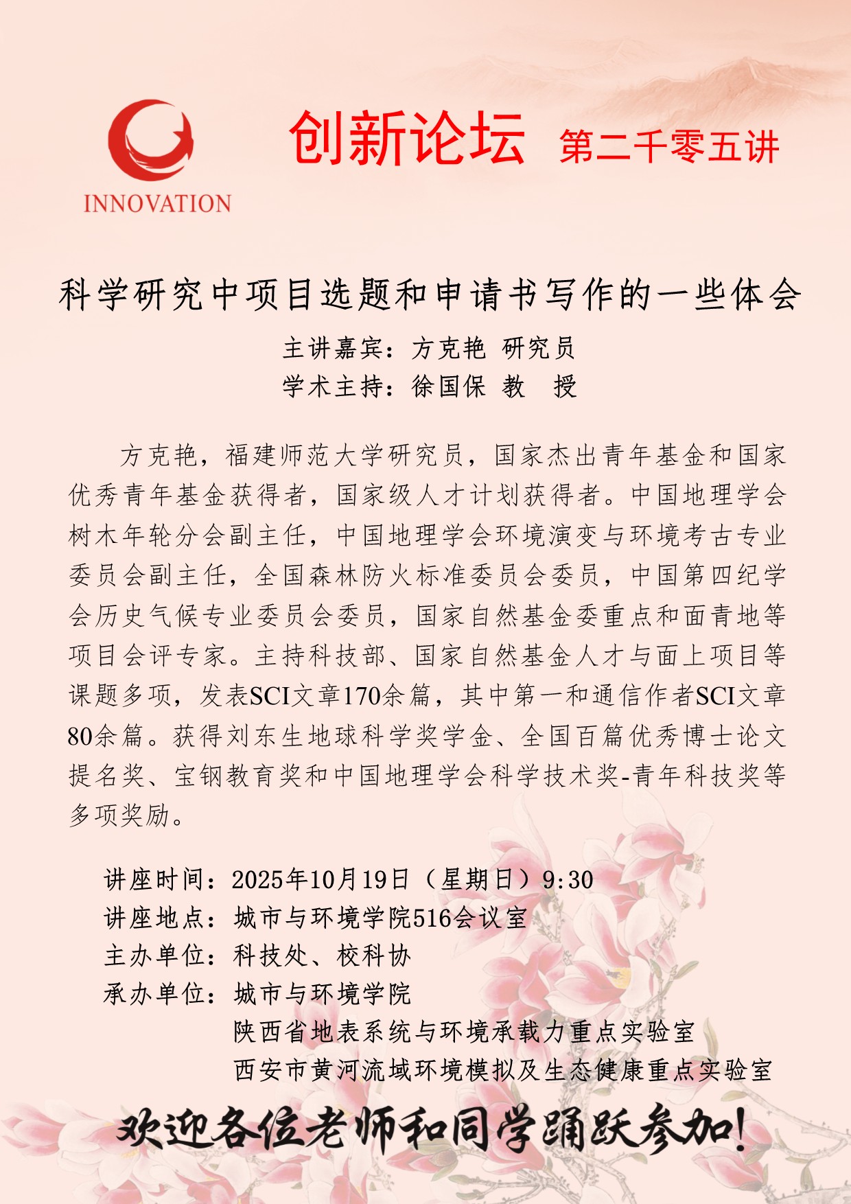 方克艳 研究员 伟德国际1946源于英国创新论坛第二千零五讲:科学研究中项目选题和申请书写作的一些体会 讲座时间 2025年10月19日(星期日)9:30 讲座地点 城市与环境学院516会议室 讲座人介绍 方克艳 研究员 讲座内容