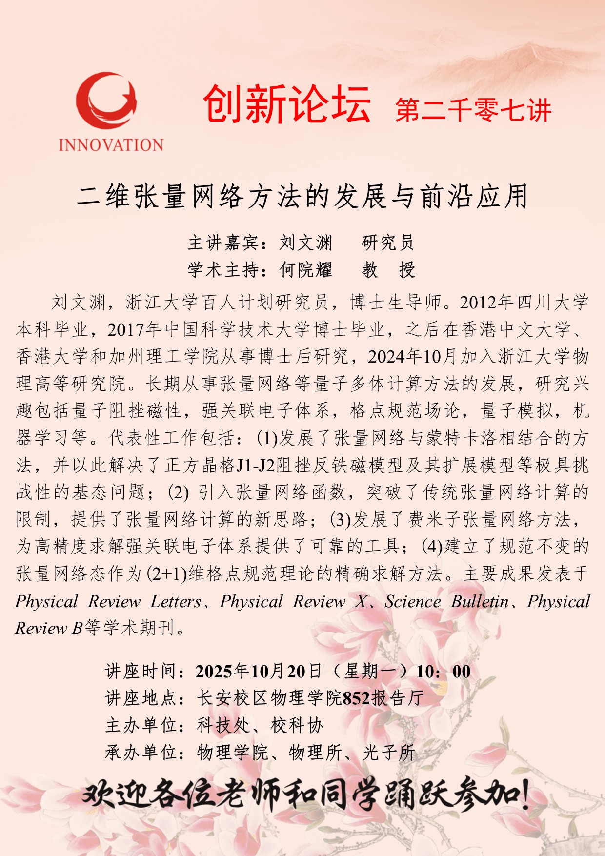 刘文渊 研究员 伟德国际1946源于英国创新论坛第二千零七讲:二维张量网络方法的发展与前沿应用 讲座时间 2025年10月20日(星期一)10:00 讲座地点 长安校区物理学院852报告厅 讲座人介绍 刘文渊 研究员 讲座内容