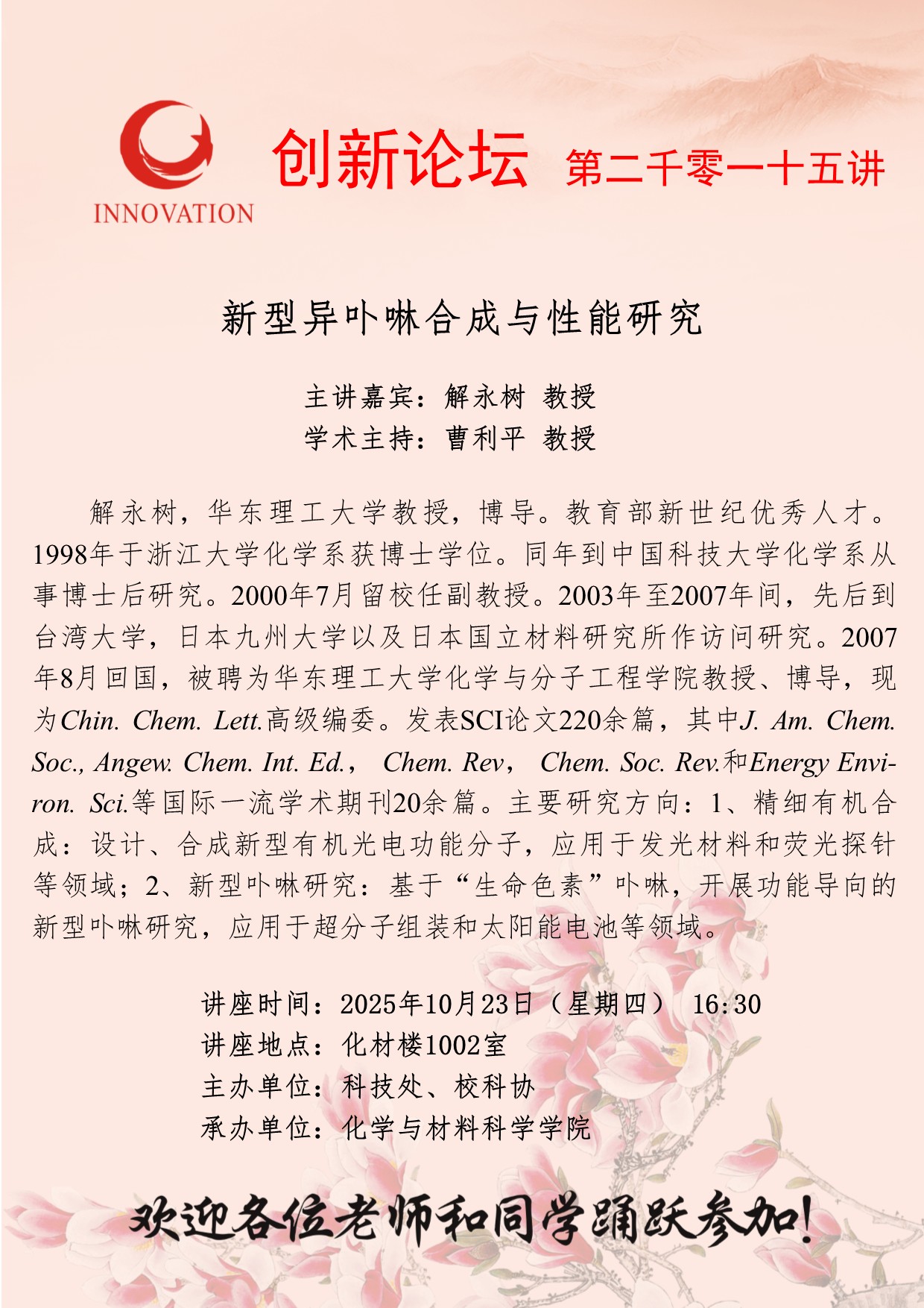 解永树 教授 伟德国际1946源于英国创新论坛第二千零一十五讲:新型异卟啉合成与性能研究 讲座时间 2025年10月23日(星期四) 16:30 讲座地点 化材楼1002室 讲座人介绍 解永树 教授 讲座内容