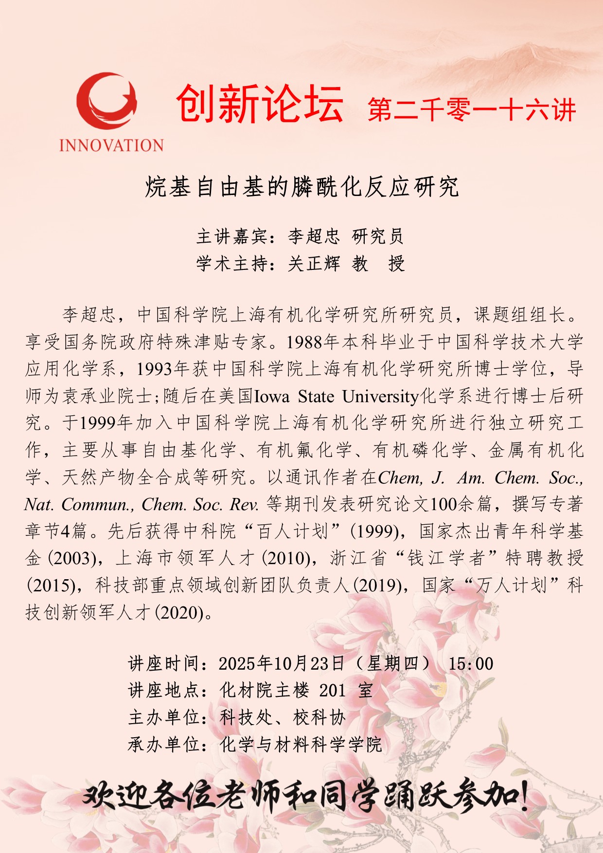李超忠 研究员 伟德国际1946源于英国创新论坛第二千零一十六讲:烷基自由基的膦酰化反应研究 讲座时间 2025年10月23日(星期四) 15:00 讲座地点 化材院主楼 201 室 讲座人介绍 李超忠 研究员 讲座内容