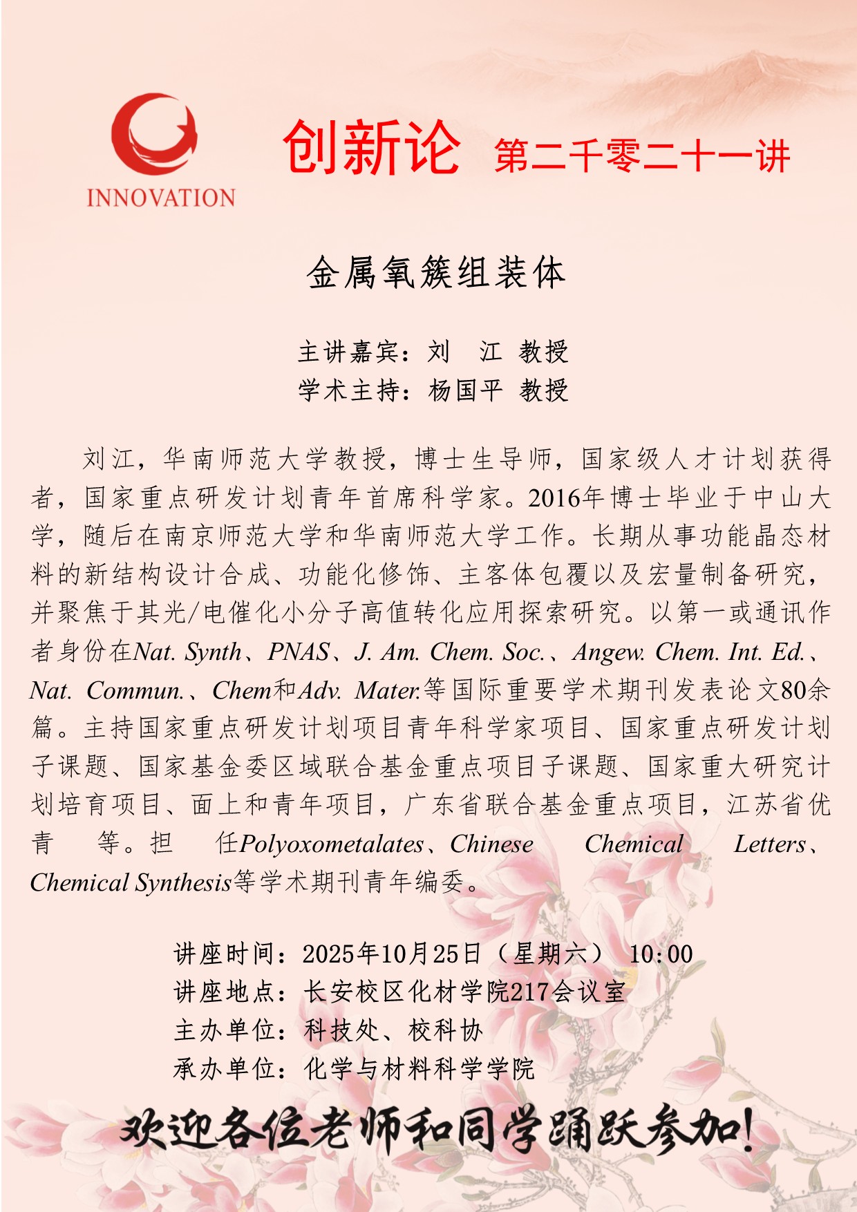刘 江 教授 伟德国际1946源于英国创新论坛第二千零二十一讲:金属氧簇组装体 讲座时间 2025年10月25日(星期六) 10:00 讲座地点 长安校区化材学院217会议室 讲座人介绍 刘 江 教授 讲座内容