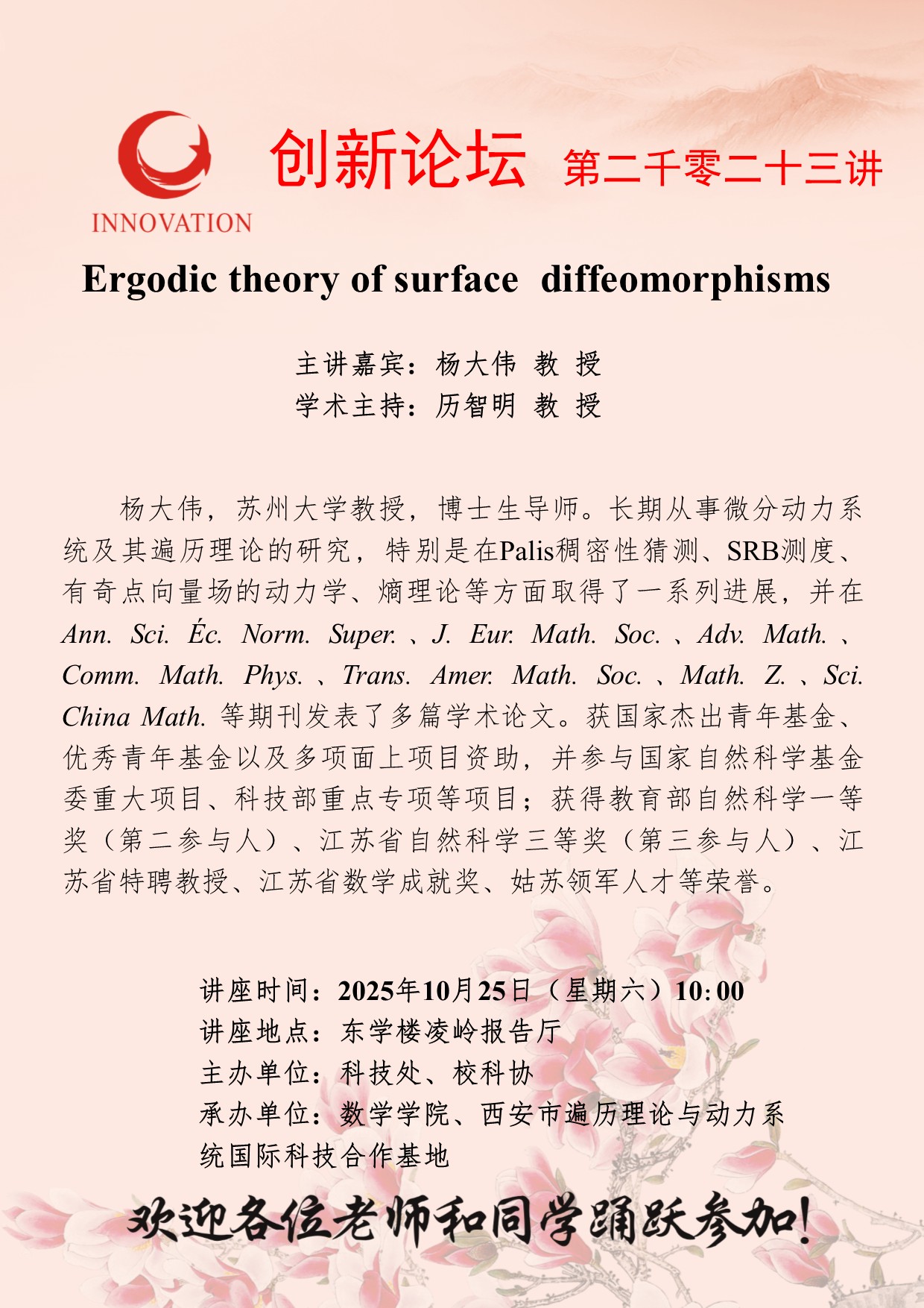杨大伟 教 授 伟德国际1946源于英国创新论坛第二千零二十三讲:Ergodic theory of surface diffeomorphisms 讲座时间 2025年10月25日(星期六)10:00 讲座地点 东学楼凌岭报告厅 讲座人介绍 杨大伟 教 授 讲座内容