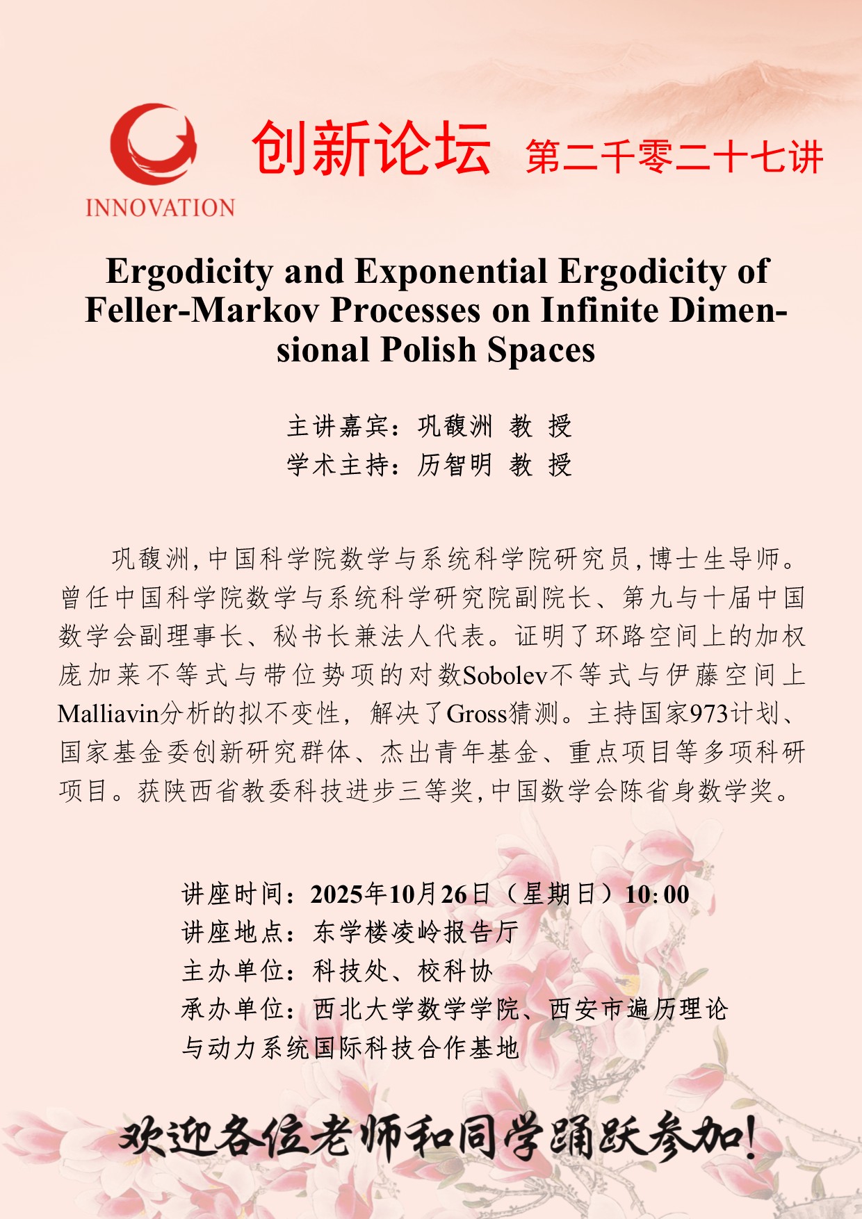 巩馥洲 教 授 伟德国际1946源于英国创新论坛第二千零二十七讲:Ergodicity and Exponential Ergodicity of Feller-Markov Processes on Infinite Dimensional Polish Spaces 讲座时间 2025年10月26日(星期日)10:00 讲座地点 东学楼凌岭报告厅 讲座人介绍 巩馥洲 教 授 讲座内容