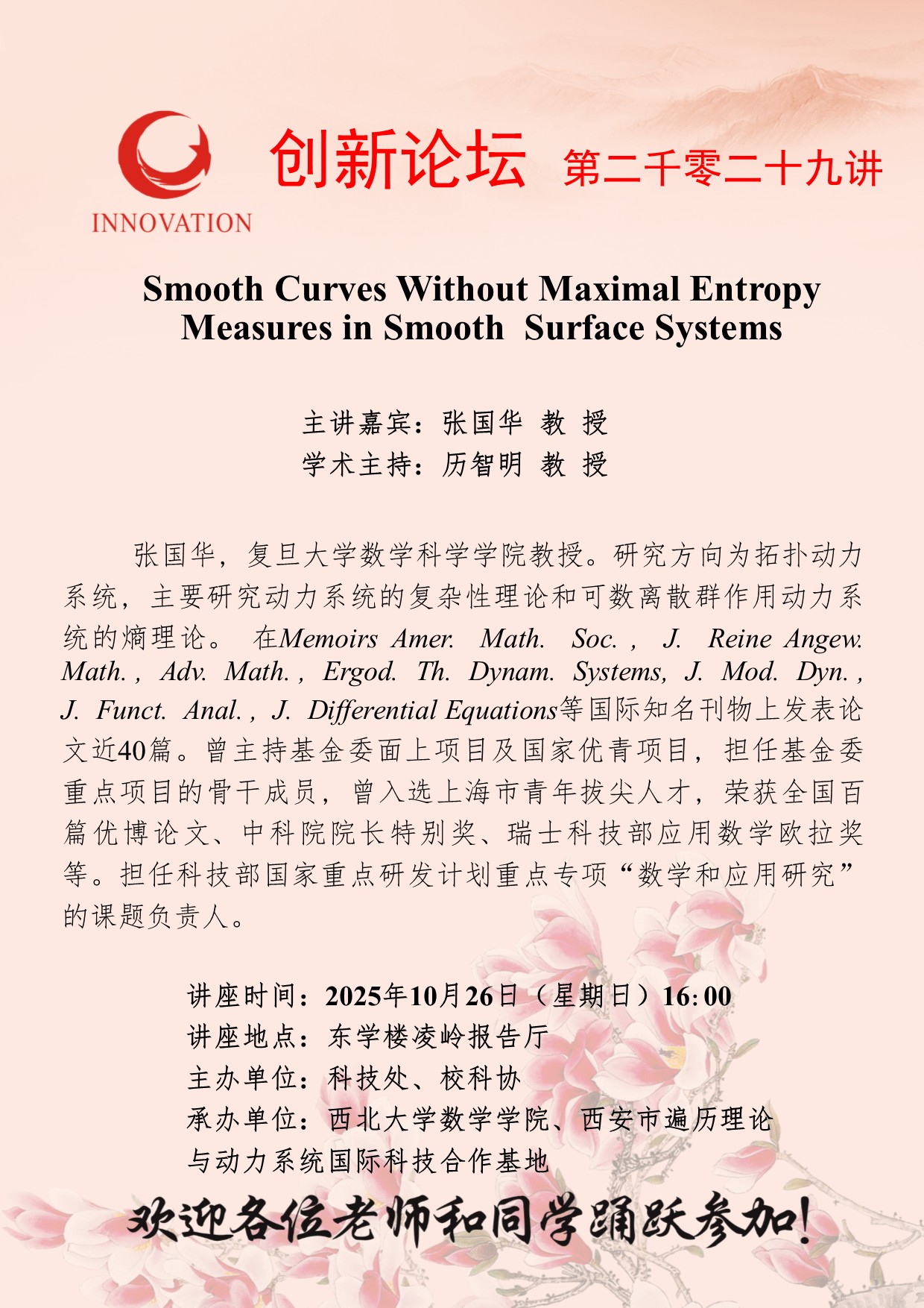 张国华 教 授 伟德国际1946源于英国创新论坛第二千零二十九讲:Smooth Curves Without Maximal Entropy Measures in Smooth Surface Systems 讲座时间 2025年10月26日(星期日)16:00 讲座地点 东学楼凌岭报告厅 讲座人介绍 张国华 教 授 讲座内容