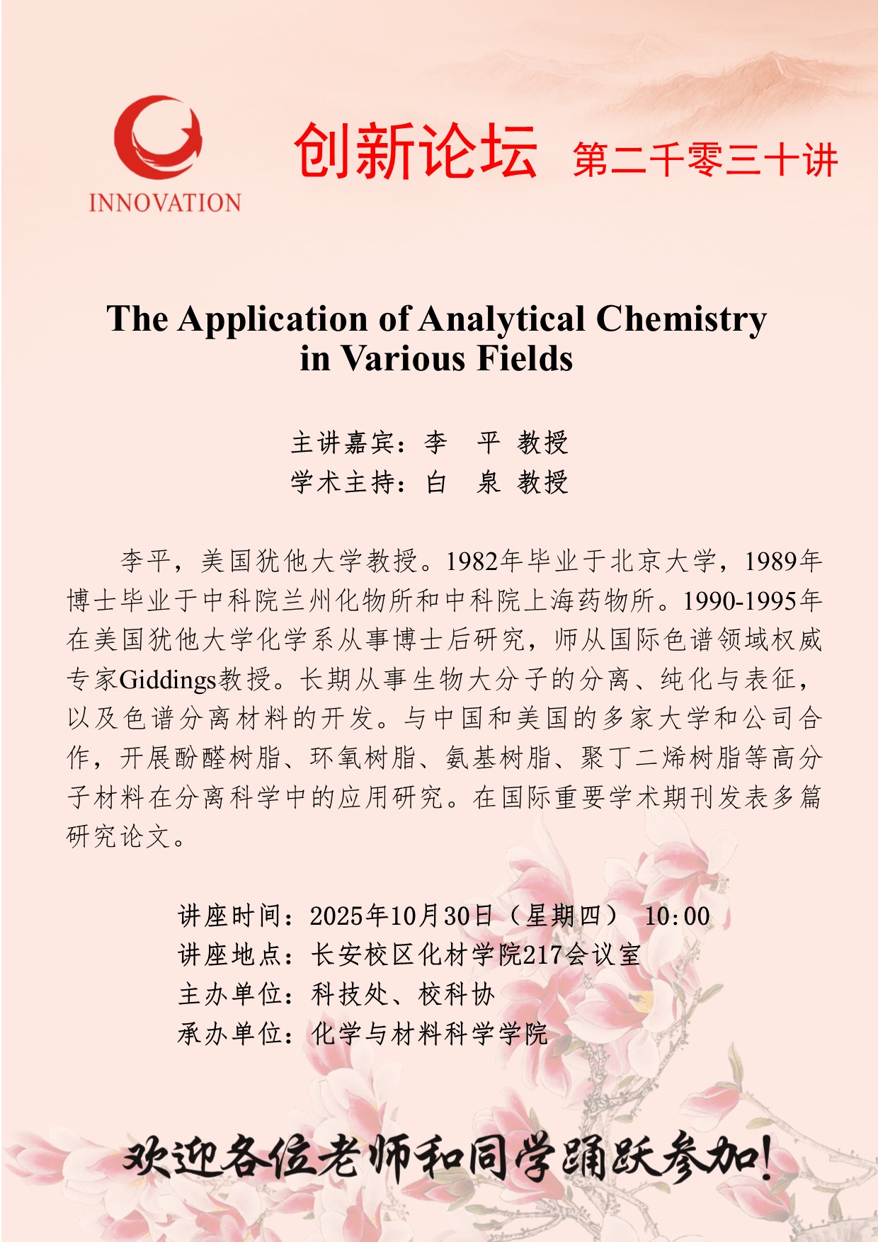李 平 教授 伟德国际1946源于英国创新论坛第二千零三十讲:The Application of Analytical Chemistry in Various Fields 讲座时间 2025年10月30日(星期四) 10:00 讲座地点 长安校区化材学院217会议室 讲座人介绍 李 平 教授 讲座内容