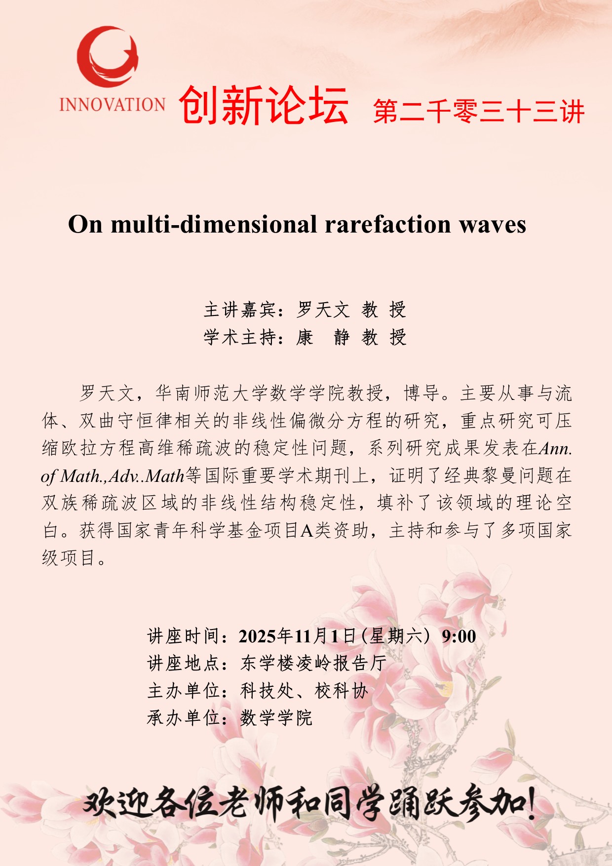 罗天文 教 授 伟德国际1946源于英国创新论坛第二千零三十三讲:On multi-dimensional rarefaction waves 讲座时间 2025年11月1日(星期六) 9:00 讲座地点 东学楼凌岭报告厅 讲座人介绍 罗天文 教 授 讲座内容