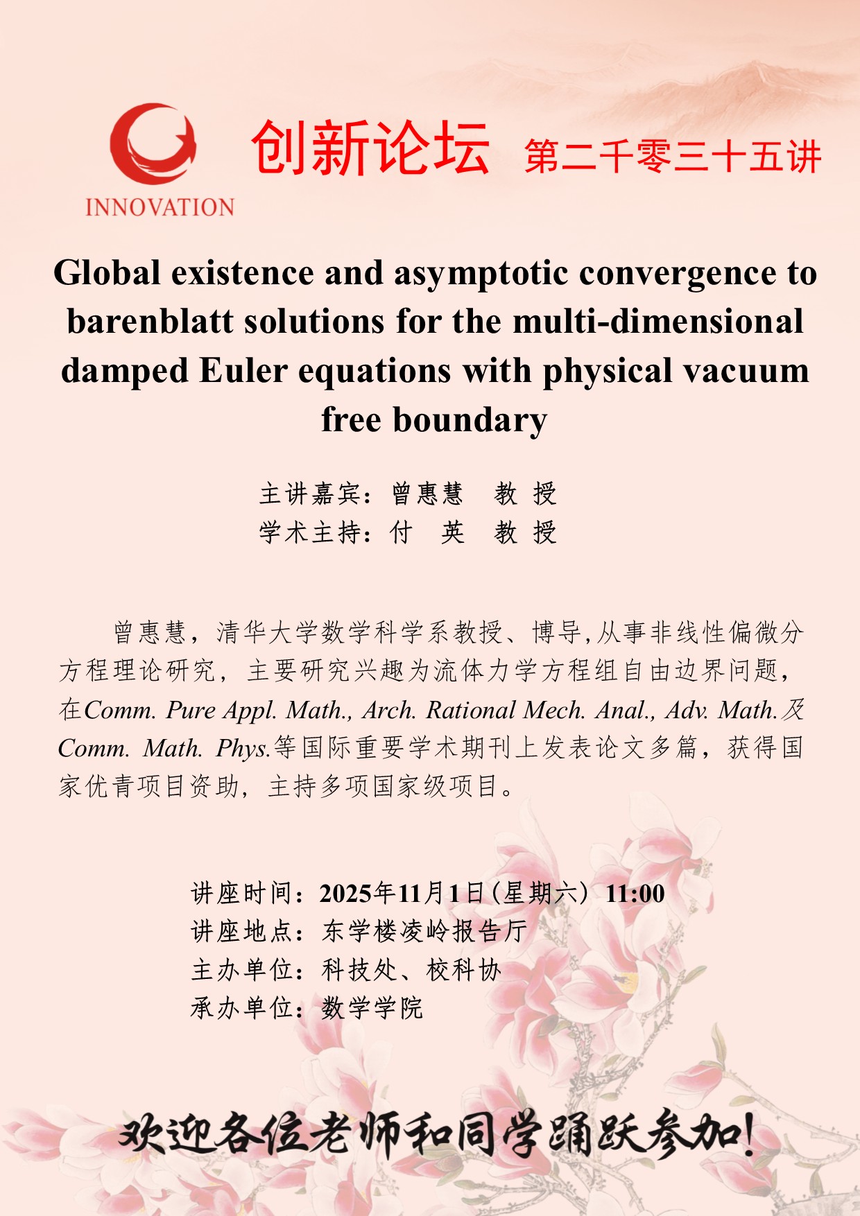曾惠慧 教 授 伟德国际1946源于英国创新论坛第二千零三十五讲:Global existence and asymptotic convergence to barenblatt solutions for the multi-dimensional damped Euler equations with physical vacuum free boundary 讲座时间 2025年11月1日(星期六) 11:00 讲座地点 东学楼凌岭报告厅 讲座人介绍 曾惠慧 教 授 讲座内容
