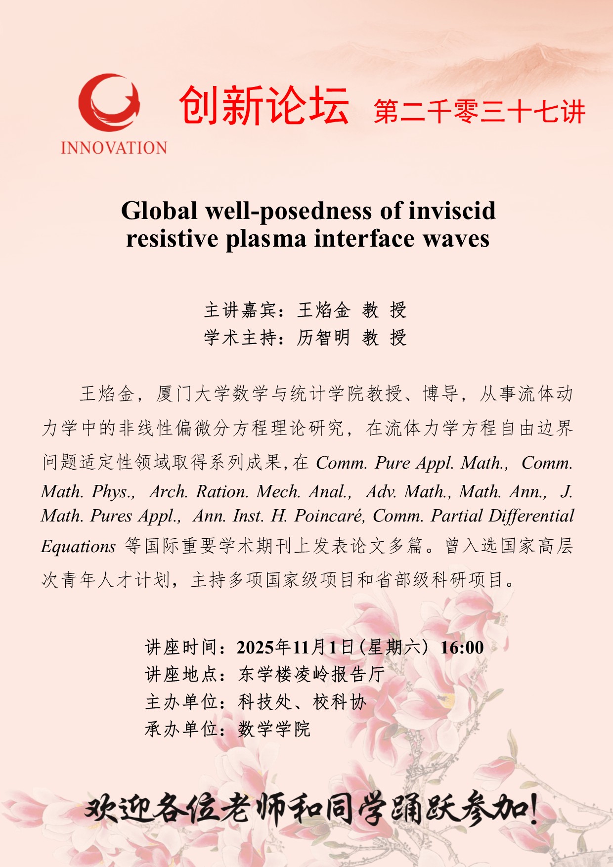 王焰金 教 授 伟德国际1946源于英国创新论坛第二千零三十七讲:Global well-posedness of inviscid resistive plasma interface waves 讲座时间 2025年11月1日(星期六) 16:00 讲座地点 东学楼凌岭报告厅 讲座人介绍 王焰金 教 授 讲座内容