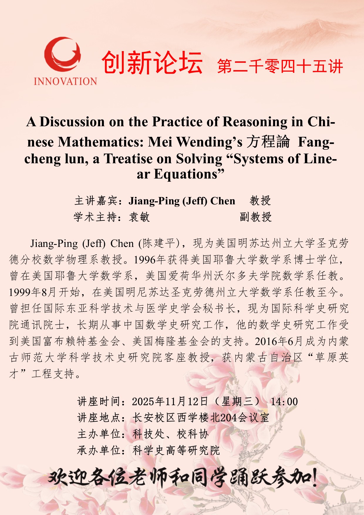 Jiang-Ping (Jeff) Chen 教授 伟德国际1946源于英国创新论坛第二千零四十五讲:A Discussion on the Practice of Reasoning in Chinese Mathematics: Mei Wending’s 方程論 Fangcheng lun, a Treatise on Solving “Systems of Linear Equations” 讲座时间 2025年11月12日(星期三) 14:00 讲座地点 长安校区西学楼北204会议室 讲座人介绍 Jiang-Ping (Jeff) Chen 教授 讲座内容