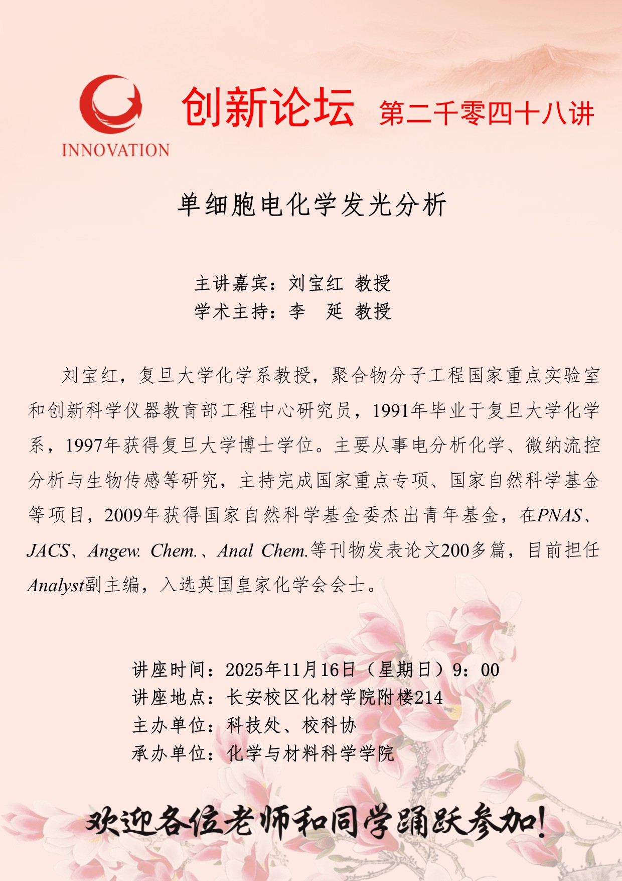 刘宝红 教授 伟德国际1946源于英国创新论坛第二千零四十八讲:单细胞电化学发光分析 讲座时间 2025年11月16日(星期日)9:00 讲座地点 长安校区化材学院附楼214 讲座人介绍 刘宝红 教授 讲座内容