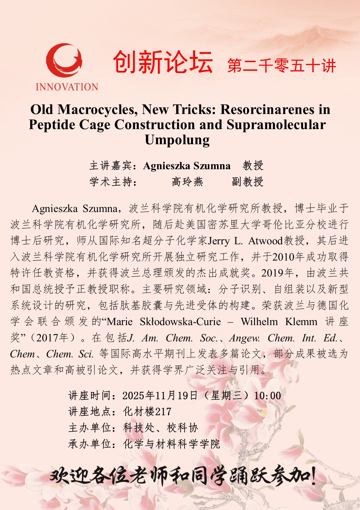 Agnieszka Szumna 教授 伟德国际1946源于英国创新论坛第二千零五十讲:Old Macrocycles, New Tricks: Resorcinarenes in Peptide Cage Construction and Supramolecular Umpolung 讲座时间 2025年11月19日(星期三)10:00 讲座地点 化材楼217 讲座人介绍 Agnieszka Szumna 教授 讲座内容