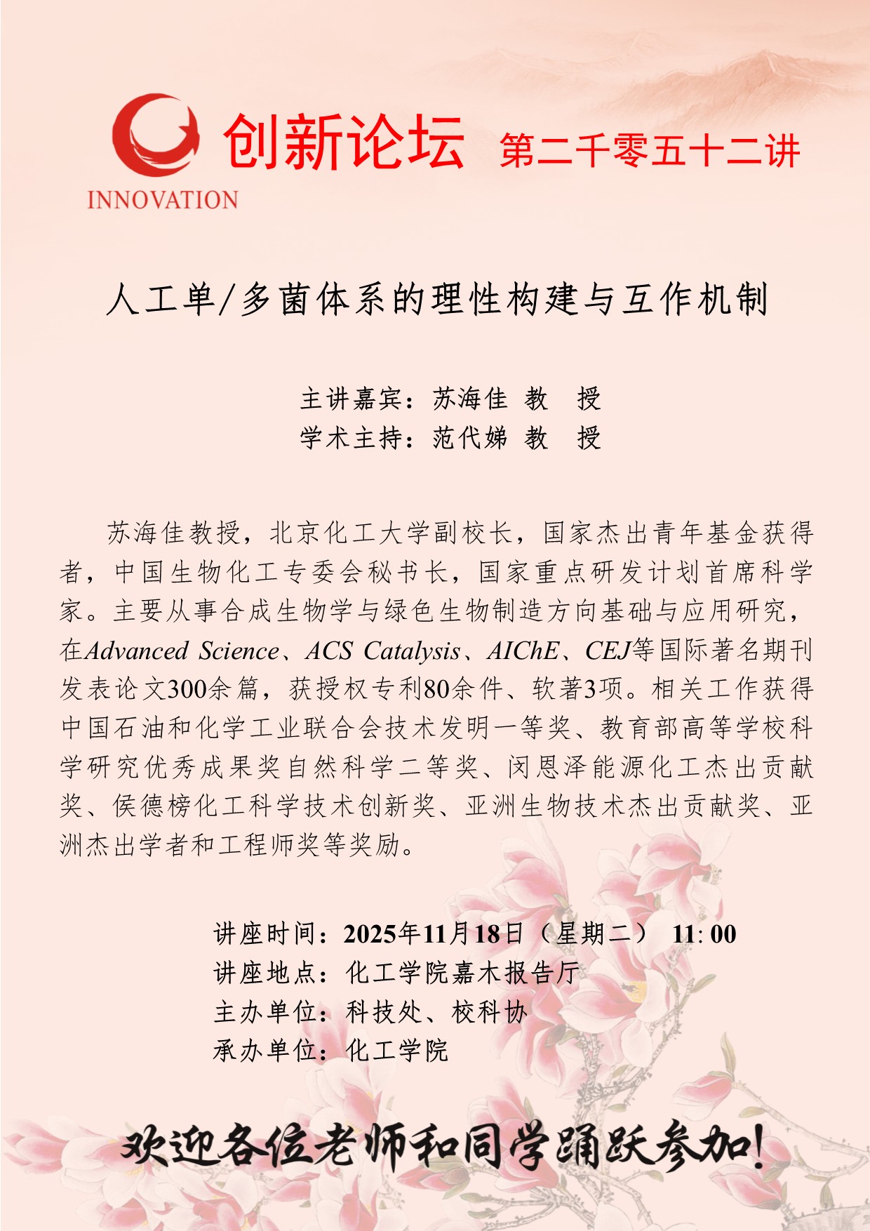 苏海佳 教授 伟德国际1946源于英国创新论坛第二千零五十二讲:人工单/多菌体系的理性构建与互作机制 讲座时间 2025年11月18日(星期二) 11: 00 讲座地点 化工学院嘉木报告厅 讲座人介绍 苏海佳 教授 讲座内容