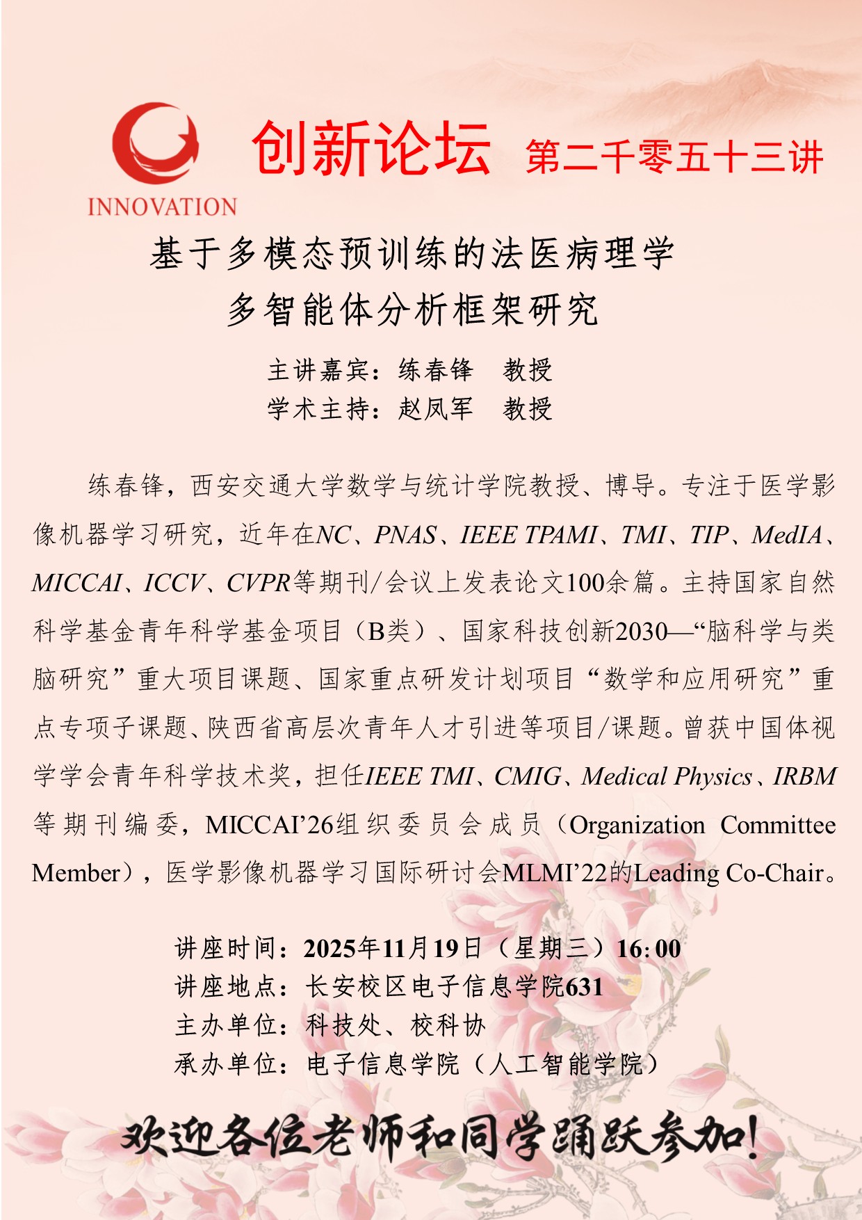 练春锋 教授 伟德国际1946源于英国创新论坛第二千零五十三讲:基于多模态预训练的法医病理学多智能体分析框架研究 讲座时间 2025年11月19日(星期三)16:00 讲座地点 长安校区电子信息学院631 讲座人介绍 练春锋 教授 讲座内容