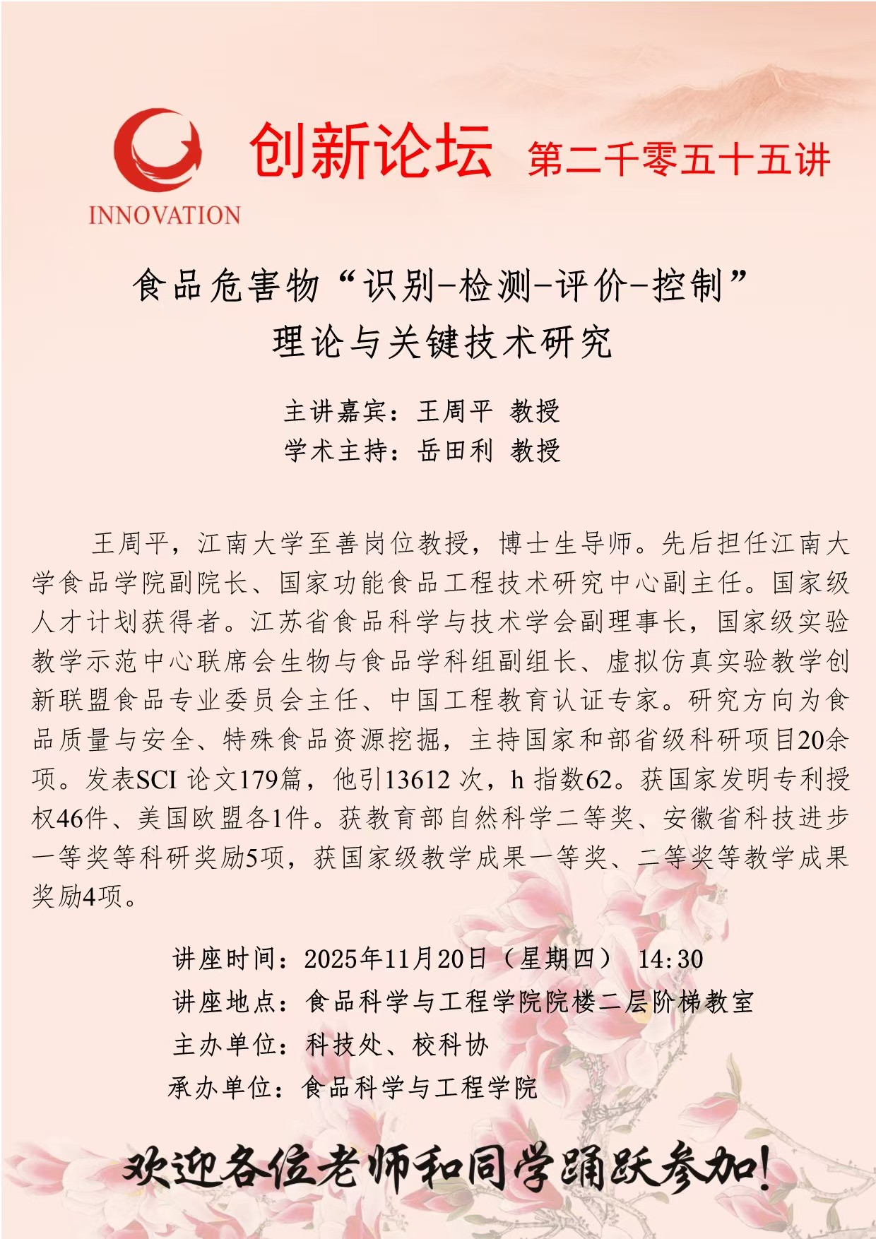 王周平 教授 伟德国际1946源于英国创新论坛第二千零五十五讲:食品危害物“识别-检测-评价-控制”理论与关键技术研究 讲座时间 2025年11月20日(星期四) 14:30 讲座地点 食品科学与工程学院院楼二层阶梯教室 讲座人介绍 王周平 教授 讲座内容