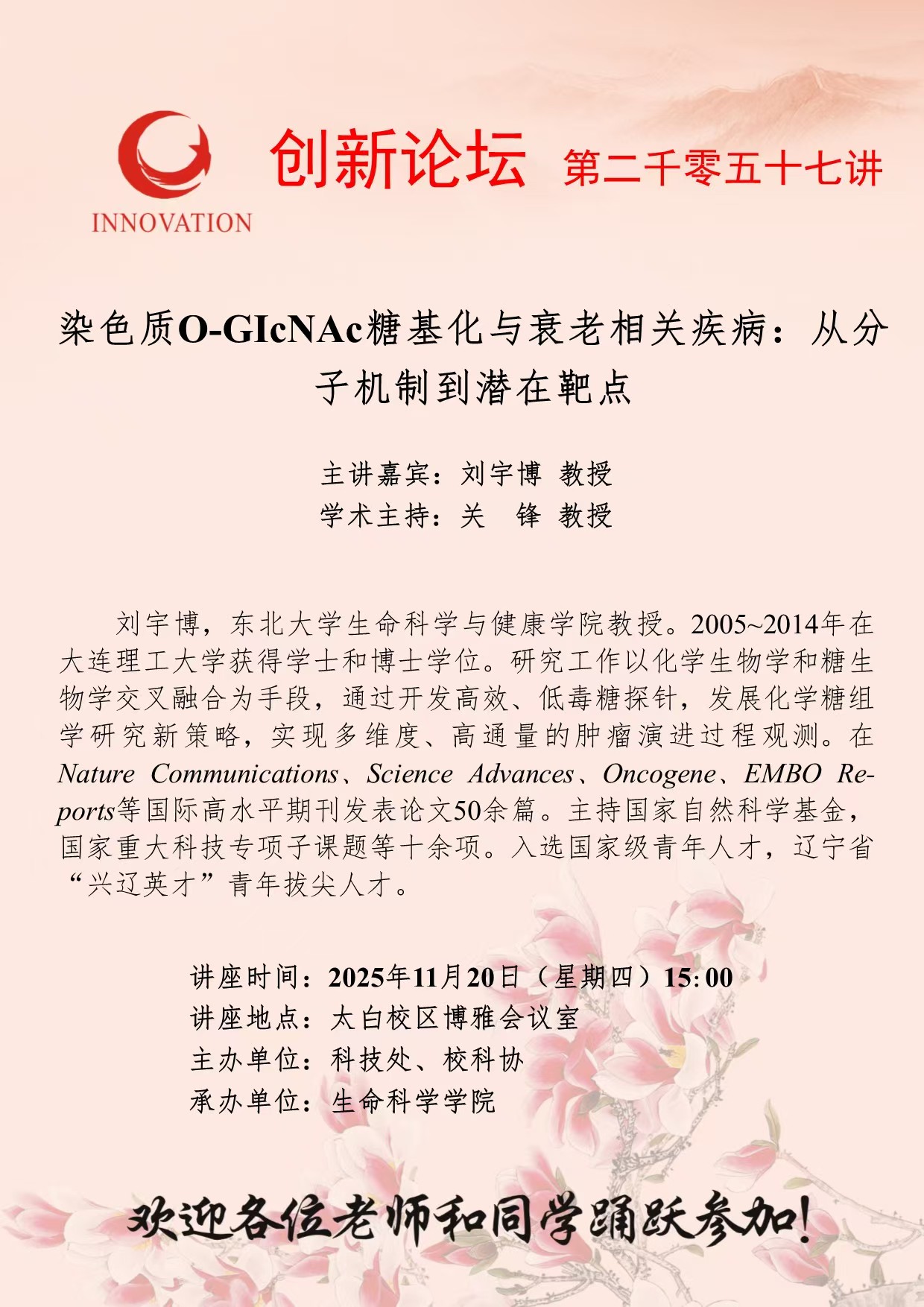 刘宇博 教授 伟德国际1946源于英国创新论坛第二千零五十七讲:染色质O-GIcNAc糖基化与衰老相关疾病:从分子机制到潜在靶点 讲座时间 2025年11月20日(星期四)15:00 讲座地点 太白校区博雅会议室 讲座人介绍 刘宇博 教授 讲座内容