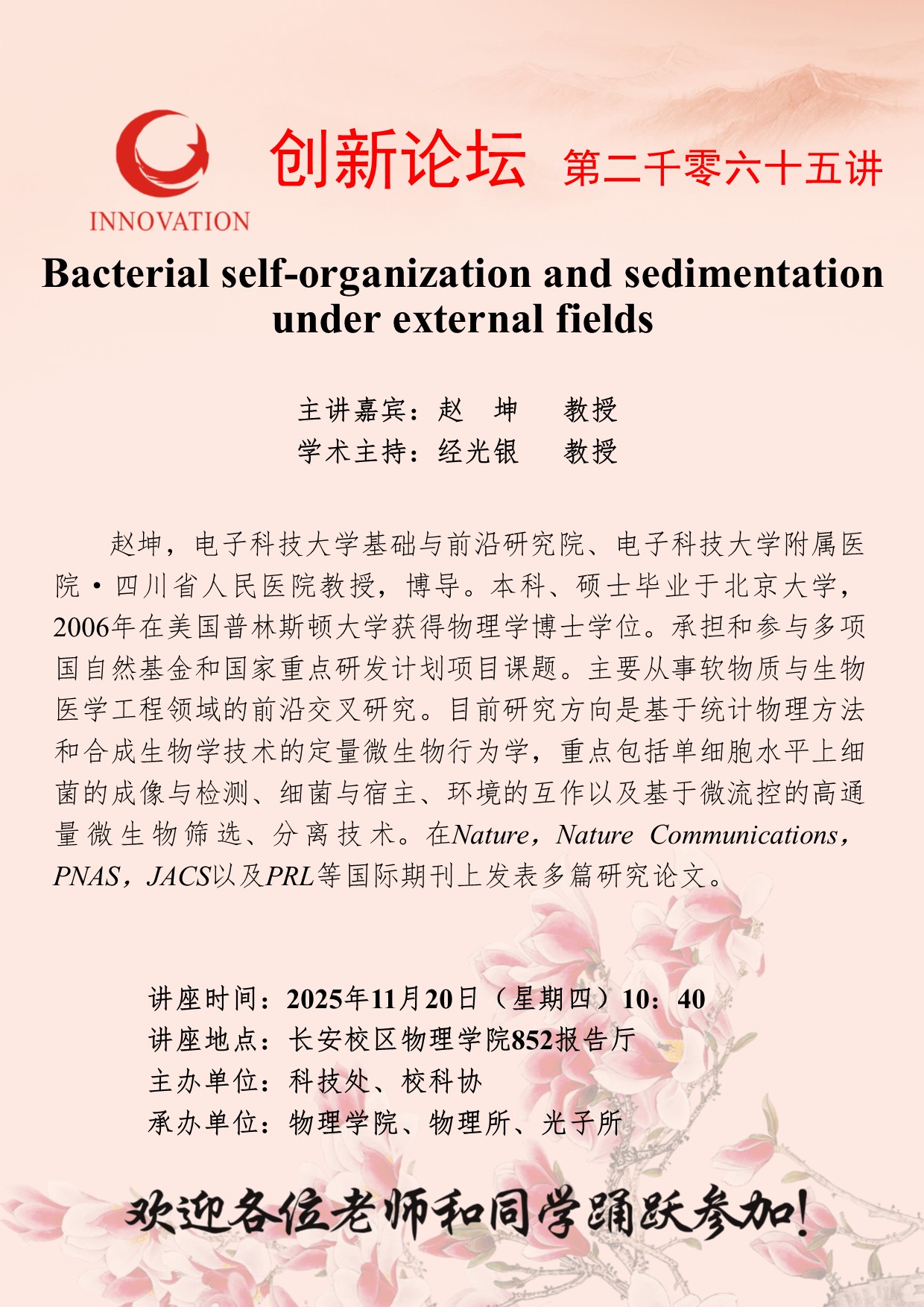 赵坤 教授 伟德国际1946源于英国创新论坛第二千零六十五讲:Bacterial self-organization and sedimentation under external fields 讲座时间 2025年11月20日(星期四)10:40 讲座地点 长安校区物理学院852报告厅 讲座人介绍 赵坤 教授 讲座内容