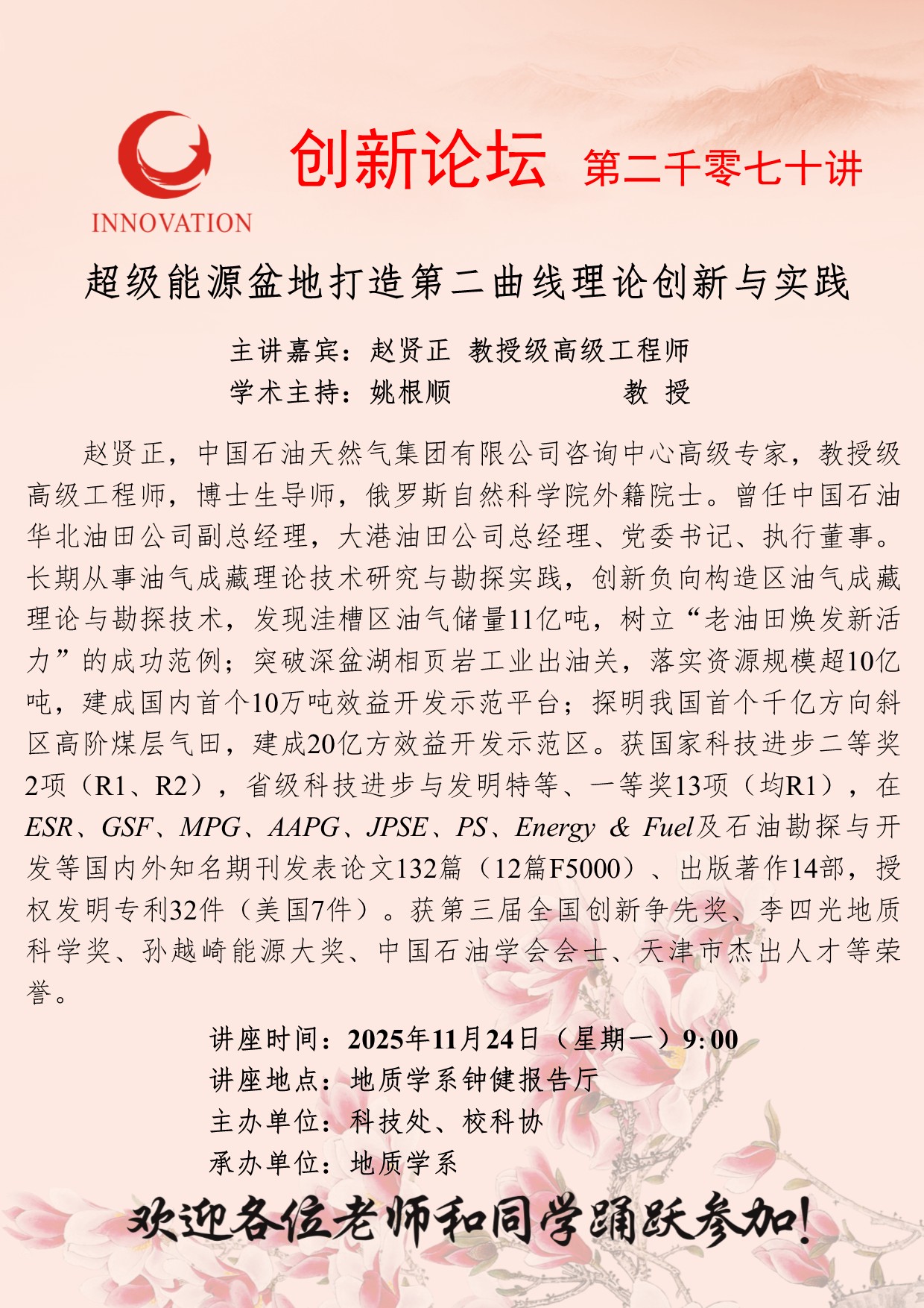 赵贤正 教授级高级工程师 伟德国际1946源于英国创新论坛第二千零七十讲:超级能源盆地打造第二曲线理论创新与实践 讲座时间 2025年11月24日(星期一)9:00 讲座地点 地质学系钟健报告厅 讲座人介绍 赵贤正 教授级高级工程师 讲座内容