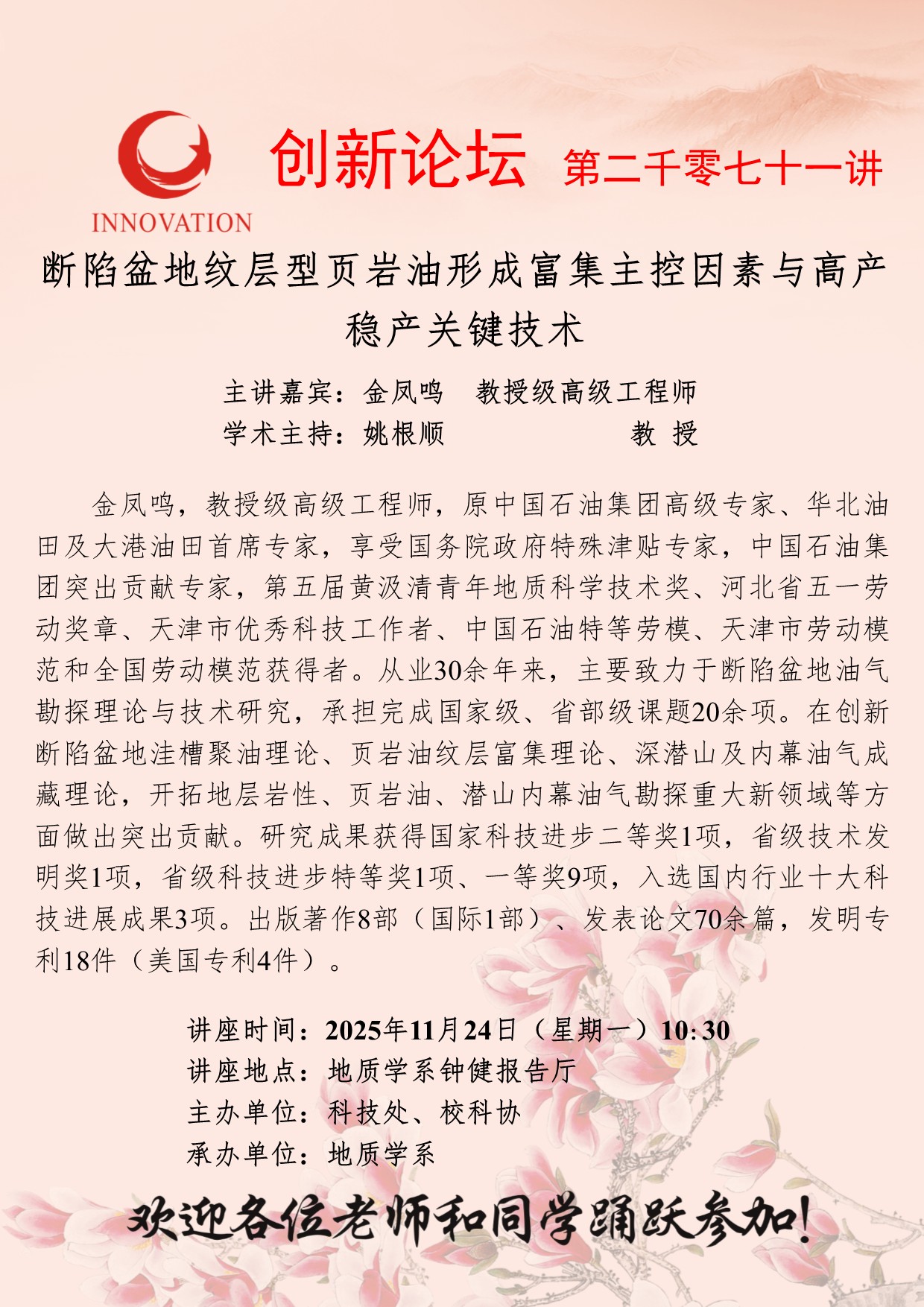 金凤鸣 教授级高级工程师 伟德国际1946源于英国创新论坛第二千零七十一讲:断陷盆地纹层型页岩油形成富集主控因素与高产稳产关键技术 讲座时间 2025年11月24日(星期一)10:30 讲座地点 地质学系钟健报告厅 讲座人介绍 金凤鸣 教授级高级工程师 讲座内容