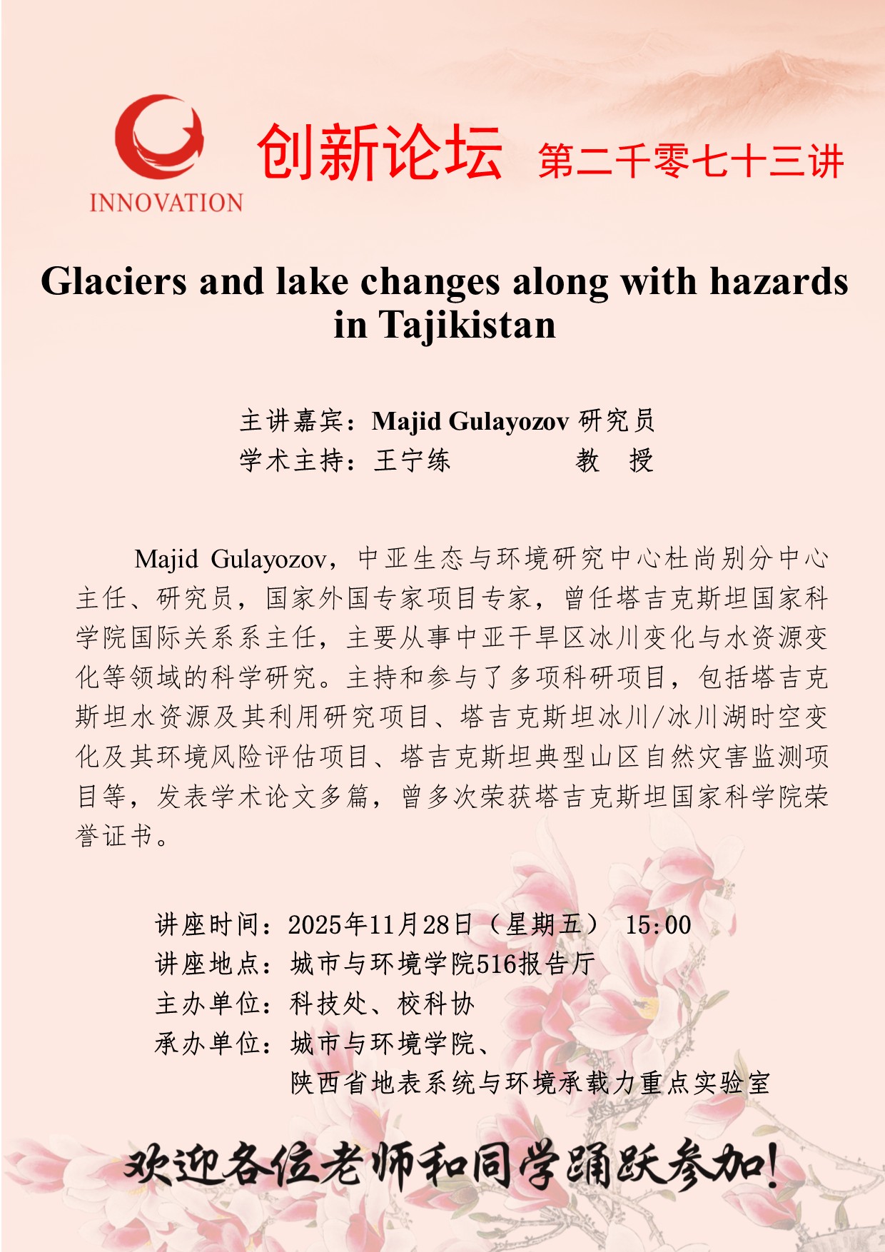 Majid Gulayozov 研究员 伟德国际1946源于英国创新论坛第二千零七十三讲:Glaciers and lake changes along with hazards in Tajikistan 讲座时间 2025年11月28日(星期五) 15:00 讲座地点 城市与环境学院516报告厅 讲座人介绍 Majid Gulayozov 研究员 讲座内容