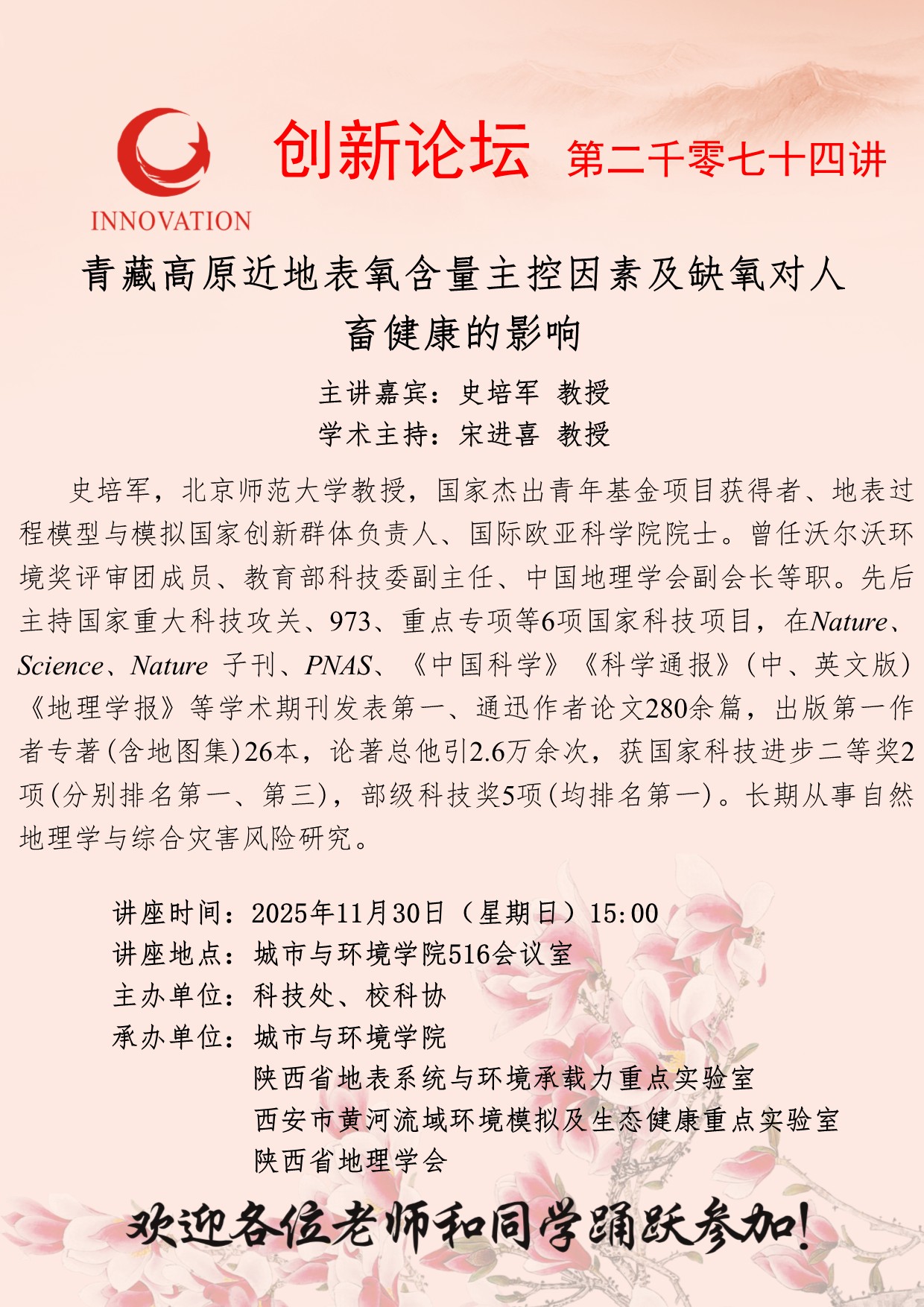 史培军 教授 伟德国际1946源于英国创新论坛第二千零七十四讲:青藏高原近地表氧含量主控因素及缺氧对人畜健康的影响 讲座时间 2025年11月30日(星期日)15:00 讲座地点 城市与环境学院516会议室 讲座人介绍 史培军 教授 讲座内容