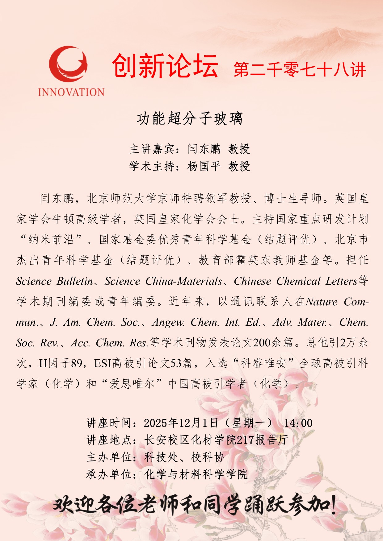 闫东鹏 教授 伟德国际1946源于英国创新论坛第二千零七十八讲:功能超分子玻璃 讲座时间 2025年12月1日(星期一) 14:00 讲座地点 长安校区化材学院217报告厅 讲座人介绍 闫东鹏 教授 讲座内容