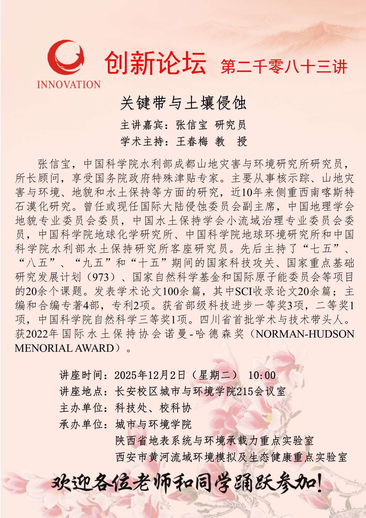 张信宝 研究员 伟德国际1946源于英国创新论坛第二千零八十三讲:关键带与土壤侵蚀 讲座时间 2025年12月02日(星期二) 10:00 讲座地点 长安校区城市与环境学院215会议室 讲座人介绍 张信宝 研究员 讲座内容