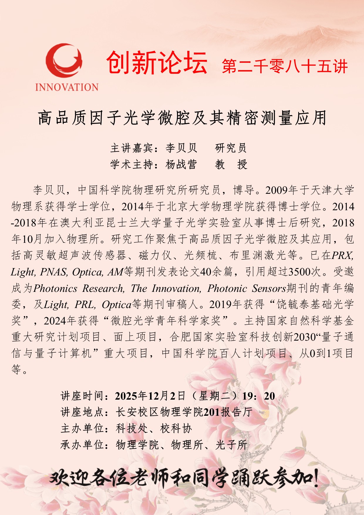 李贝贝 研究员 伟德国际1946源于英国创新论坛第二千零八十五讲:高品质因子光学微腔及其精密测量应用 讲座时间 2025年12月2日(星期二)19:20 讲座地点 长安校区物理学院201报告厅 讲座人介绍 李贝贝 研究员 讲座内容