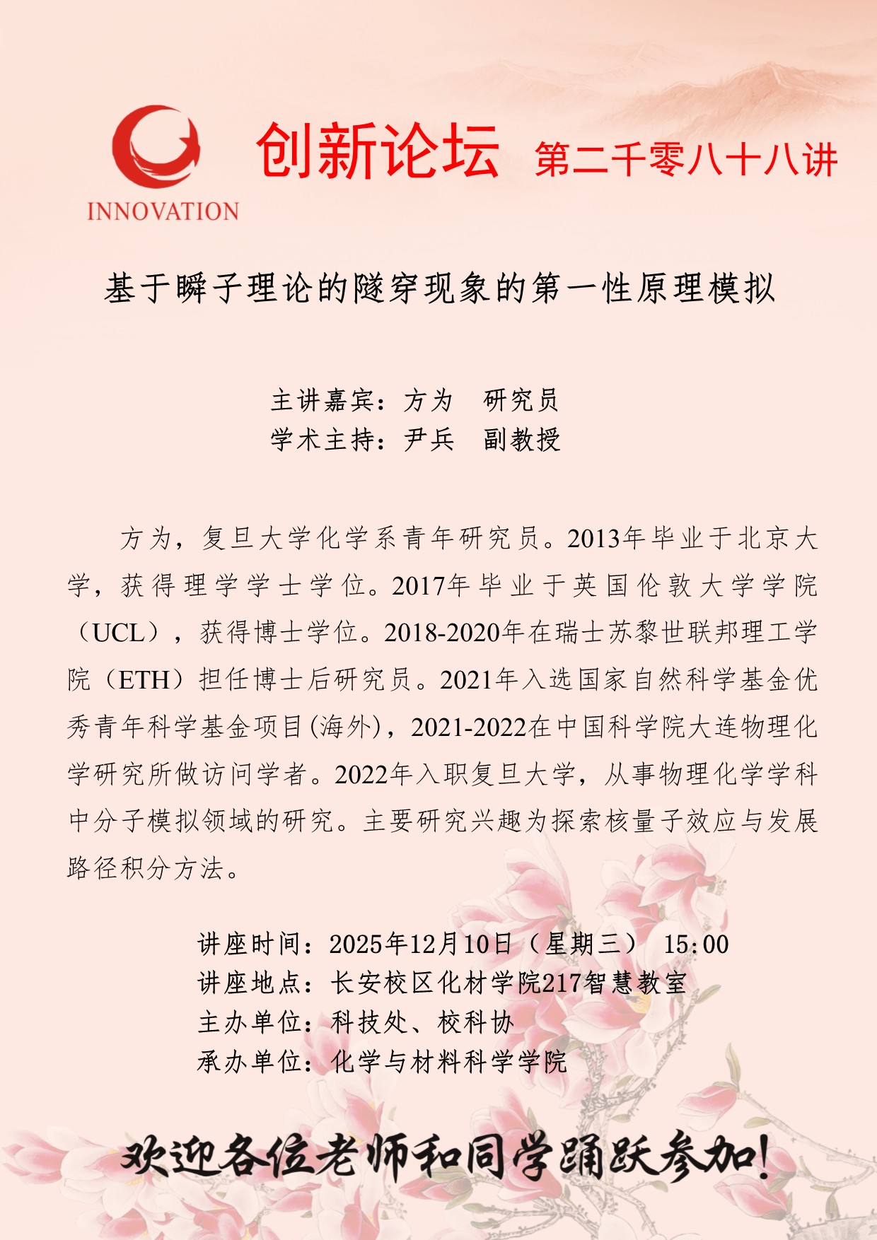 方为 研究员 伟德国际1946源于英国创新论坛第二千零八十八讲:基于瞬子理论的隧穿现象的第一性原理模拟 讲座时间 2025年12月10日(星期三) 15:00 讲座地点 长安校区化材学院217智慧教室 讲座人介绍 方为 研究员 讲座内容