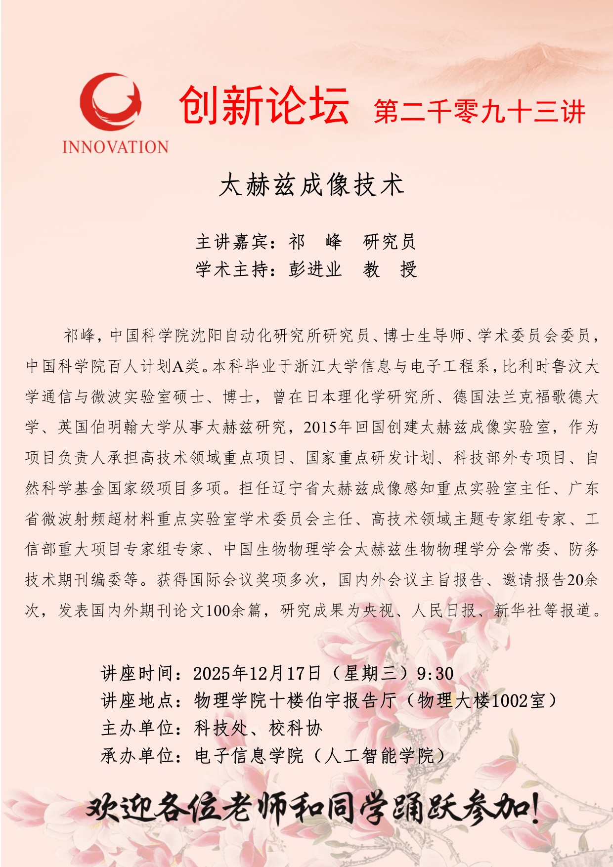 祁峰 研究员 伟德国际1946源于英国创新论坛第二千零九十三讲:太赫兹成像技术 讲座时间 2025年12月17日(星期三)9:30 讲座地点 物理学院十楼伯宇报告厅(物理大楼1002室) 讲座人介绍 祁峰 研究员 讲座内容