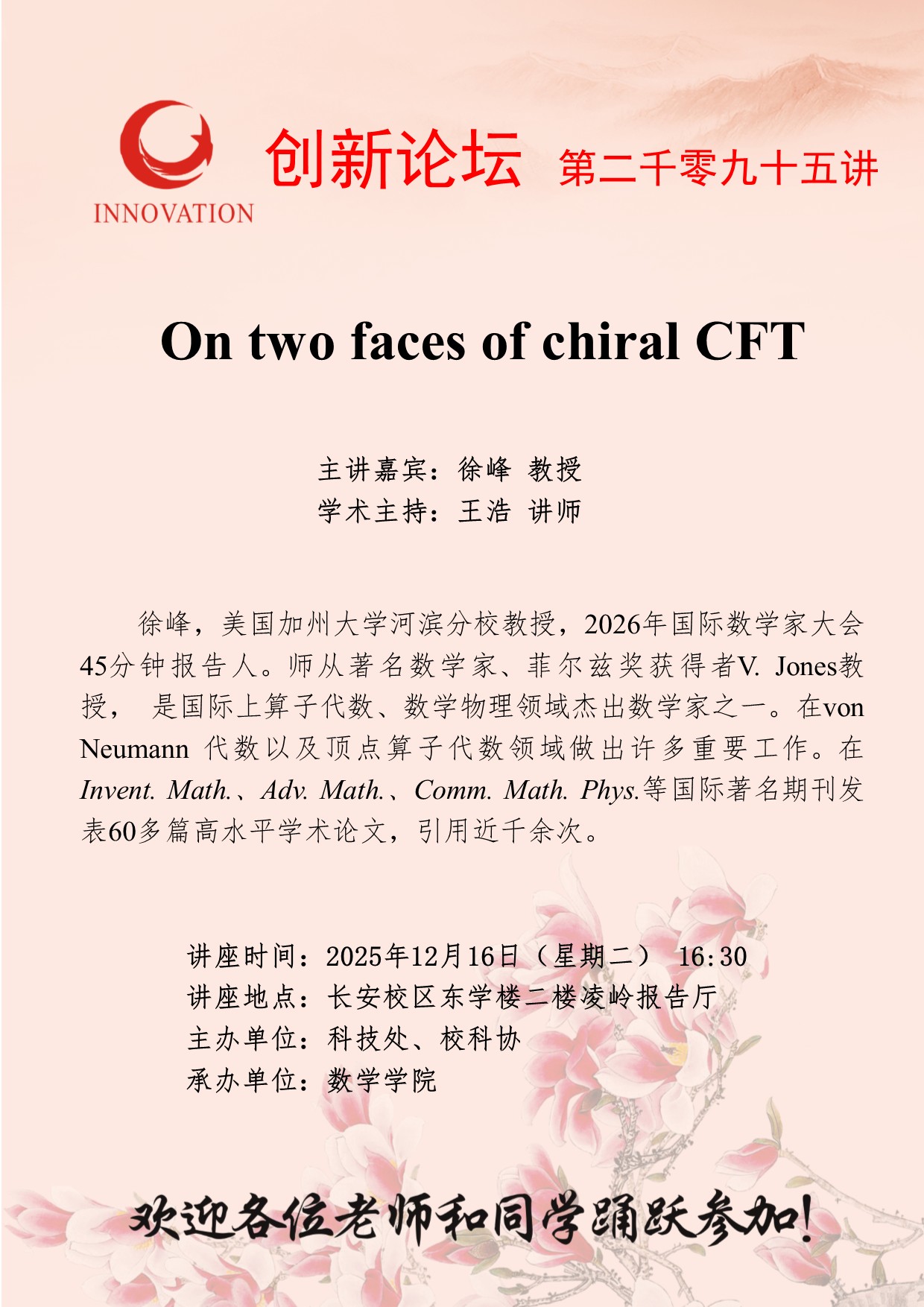 徐峰 教授 伟德国际1946源于英国创新论坛第二千零九十五讲:On two faces of chiral CFT 讲座时间 2025年12月16日(星期二) 16:30 讲座地点 长安校区东学楼二楼凌岭报告厅 讲座人介绍 徐峰 教授 讲座内容
