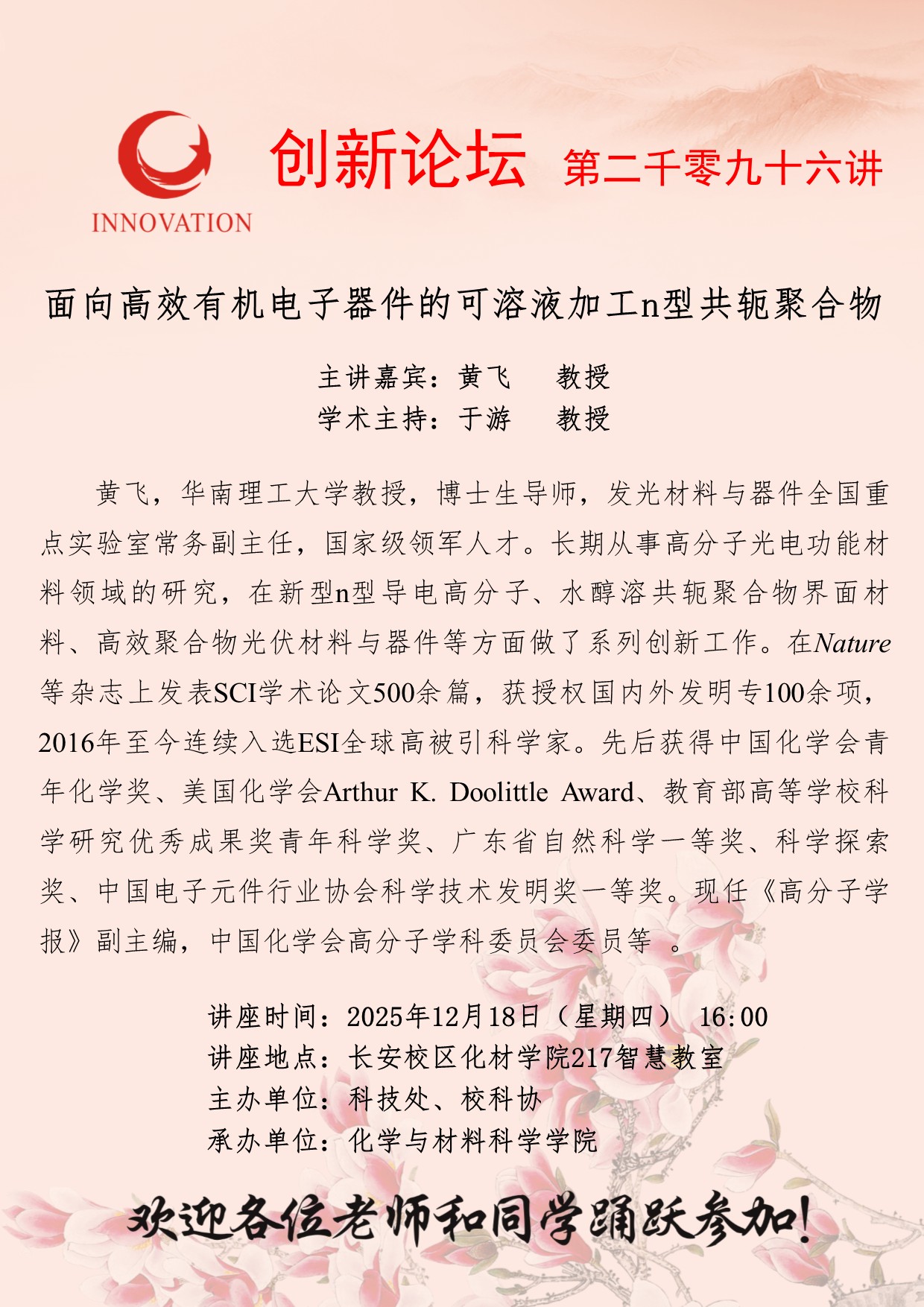 黄飞 教授 伟德国际1946源于英国创新论坛第二千零九十六讲:面向高效有机电子器件的可溶液加工n型共轭聚合物 讲座时间 2025年12月18日(星期四) 16:00 讲座地点 长安校区化材学院217智慧教室 讲座人介绍 黄飞 教授 讲座内容