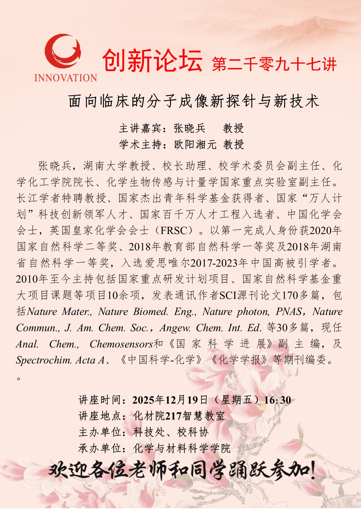 张晓兵 教授 伟德国际1946源于英国创新论坛第二千零九十七讲:面向临床的分子成像新探针与新技术 讲座时间 2025年12月19日(星期五)16:30 讲座地点 化材院217智慧教室 讲座人介绍 张晓兵 教授 讲座内容