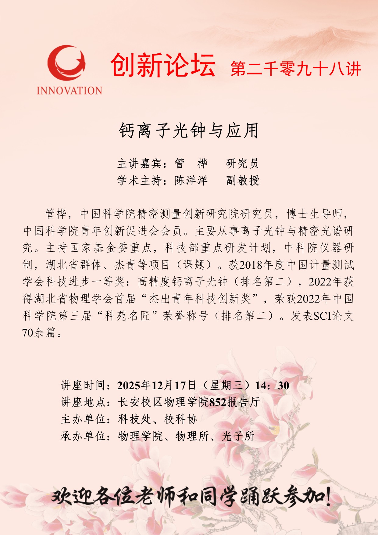 管桦 研究员 伟德国际1946源于英国创新论坛第二千零九十八讲:钙离子光钟与应用 讲座时间 2025年12月17日(星期三)14:30 讲座地点 长安校区物理学院852报告厅 讲座人介绍 管桦 研究员 讲座内容