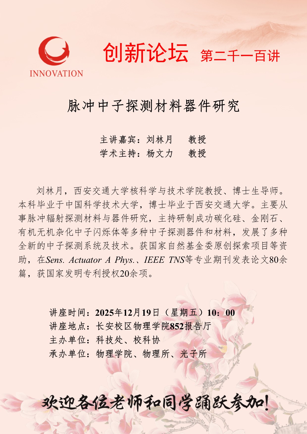 刘林月 教授 伟德国际1946源于英国创新论坛第两千一百讲:脉冲中子探测材料器件研究 讲座时间 2025年12月19日(星期五)10:00 讲座地点 长安校区物理学院852报告厅 讲座人介绍 刘林月 教授 讲座内容