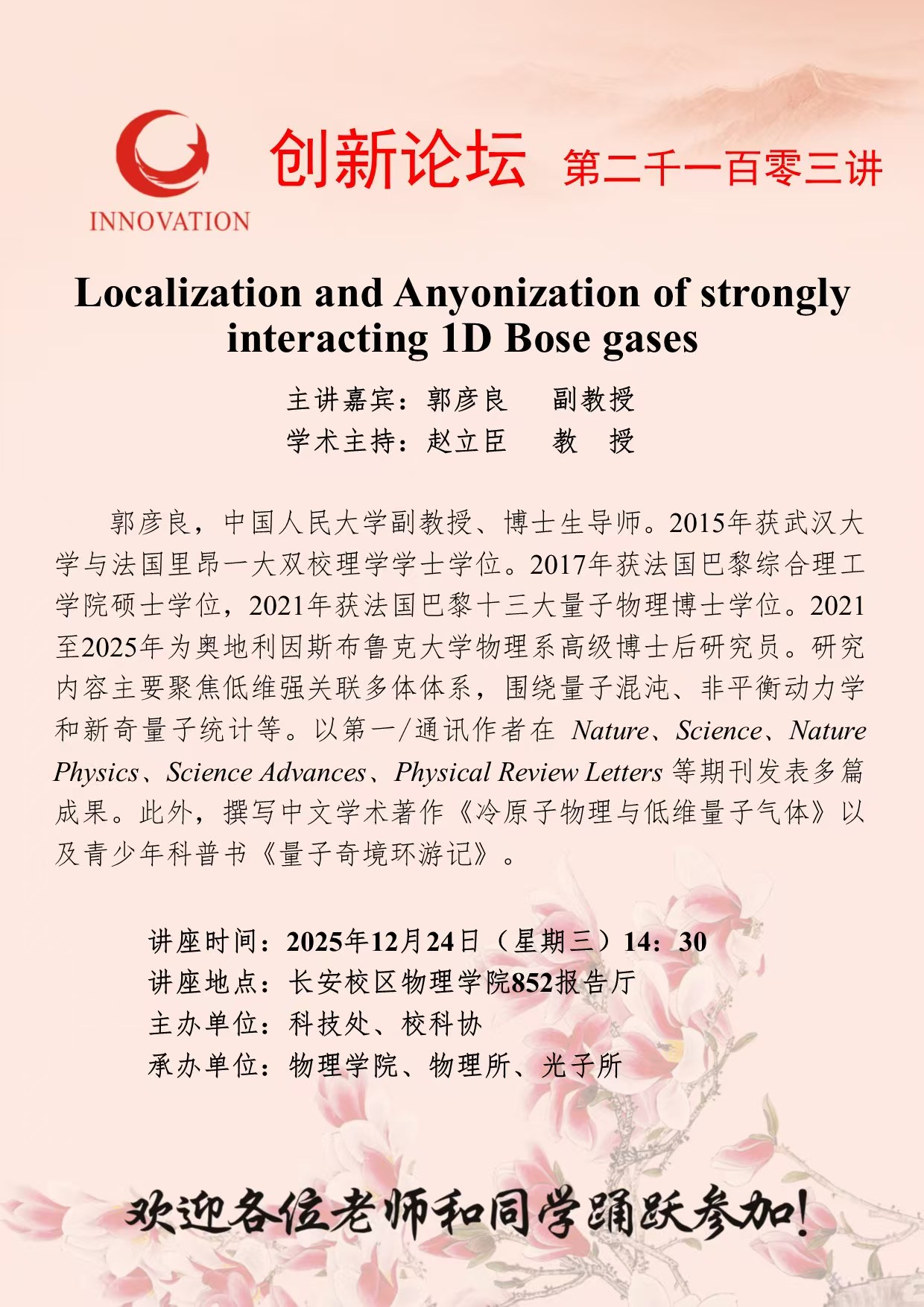 郭彦良 副教授 伟德国际1946源于英国创新论坛第二千一百零三讲:Localization and Anyonization of strongly interacting 1D Bose gases 讲座时间 2025年12月24日(星期三)14:30 讲座地点 长安校区物理学院852报告厅 讲座人介绍 郭彦良 副教授 讲座内容