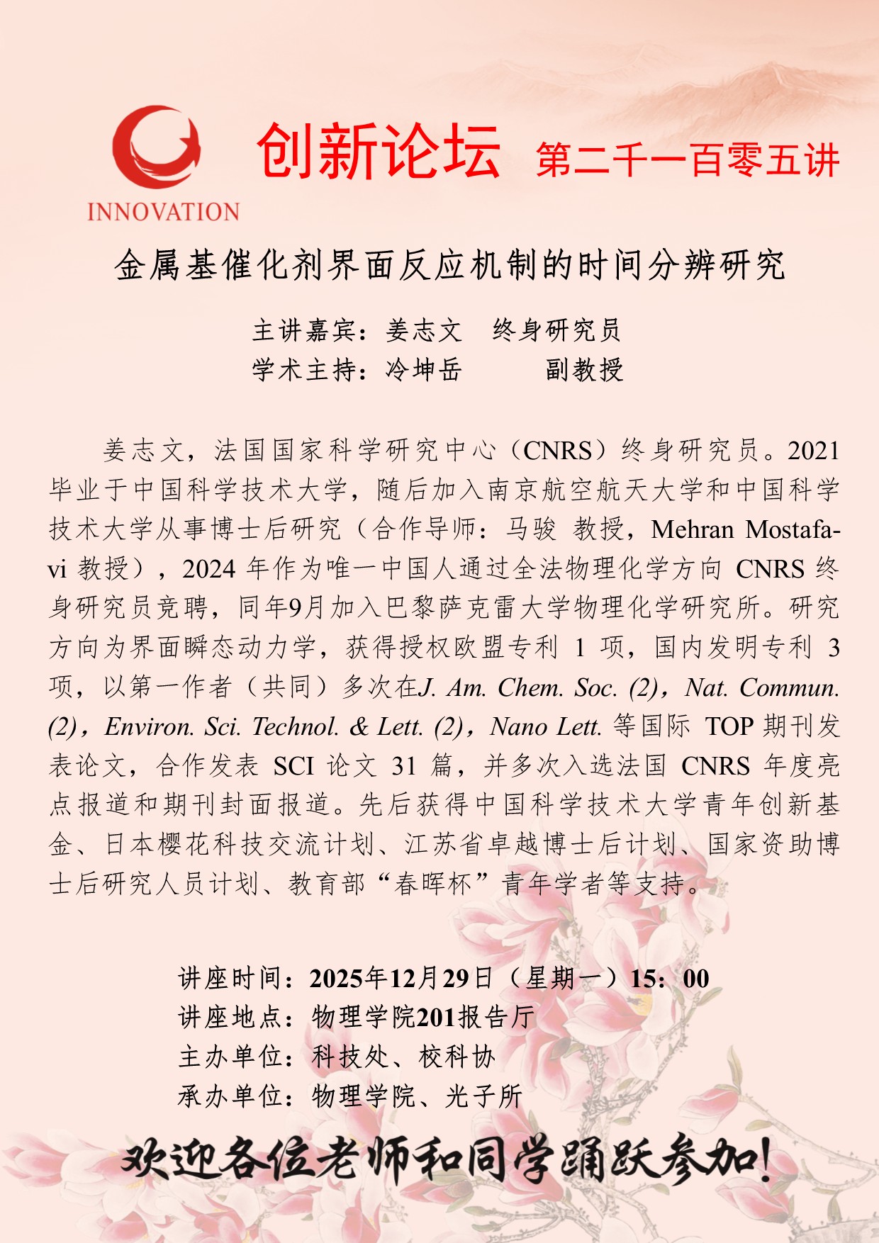 姜志文 终身研究员 伟德国际1946源于英国创新论坛第二千一百零五讲:金属基催化剂界面反应机制的时间分辨研究 讲座时间 2025年12月29日(星期一)15:00 讲座地点 物理学院201报告厅 讲座人介绍 姜志文 终身研究员 讲座内容