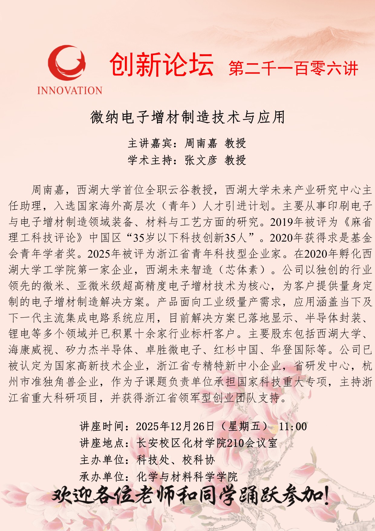 周南嘉 教授 伟德国际1946源于英国创新论坛第二千一百零六讲:微纳电子增材制造技术与应用 讲座时间 2025年12月26日(星期五) 11:00 讲座地点 长安校区化材学院210会议室 讲座人介绍 周南嘉 教授 讲座内容