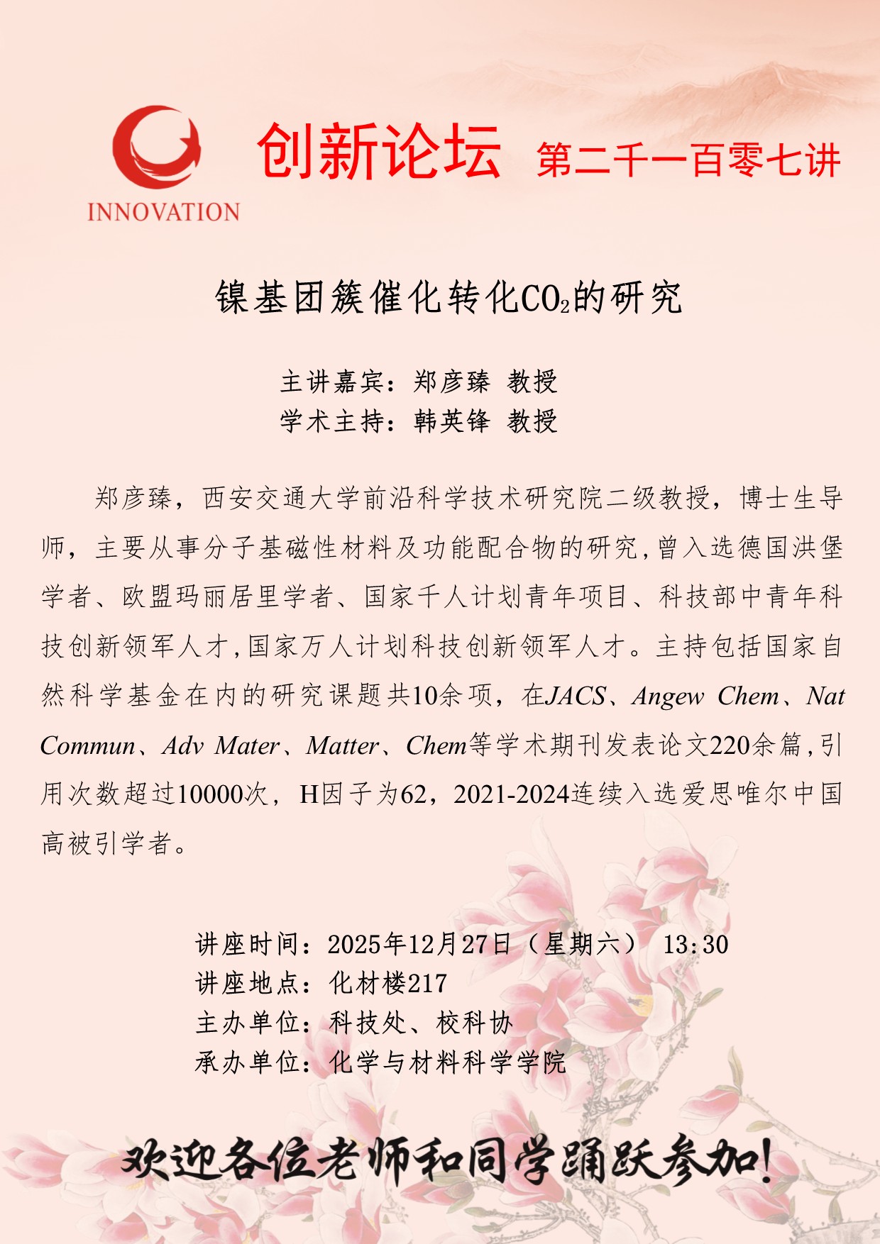 郑彦臻 教授 伟德国际1946源于英国创新论坛第二千一百零七讲:镍基团簇催化转化CO2的研究 讲座时间 2025年12月27日(星期六) 13:30 讲座地点 化材楼217 讲座人介绍 郑彦臻 教授 讲座内容