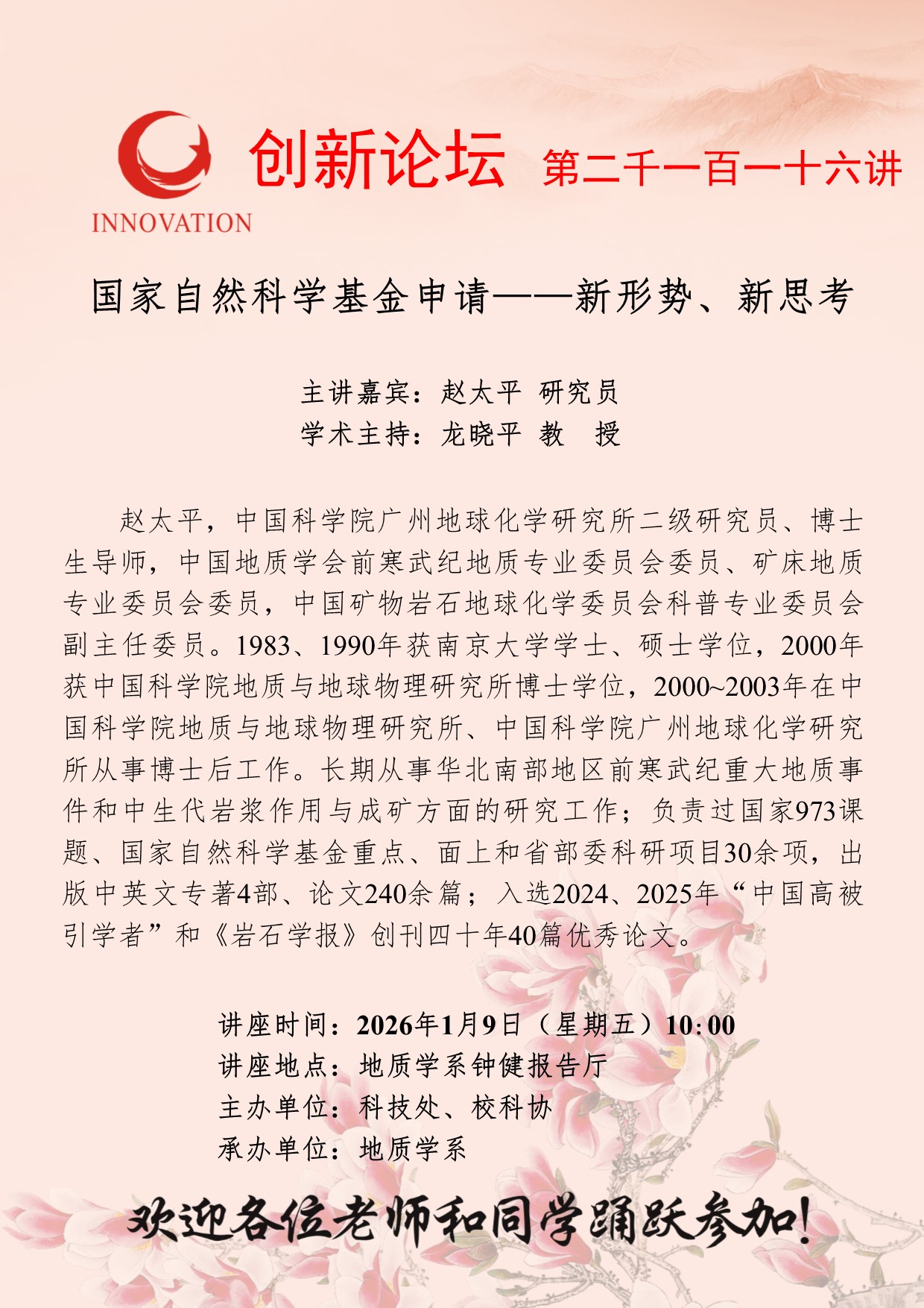 赵太平 研究员 伟德国际1946源于英国创新论坛第二千一百一十六讲:国家自然科学基金申请——新形势、新思考 讲座时间 2026年1月9日(星期五)10:00 讲座地点 地质学系钟健报告厅 讲座人介绍 赵太平 研究员 讲座内容