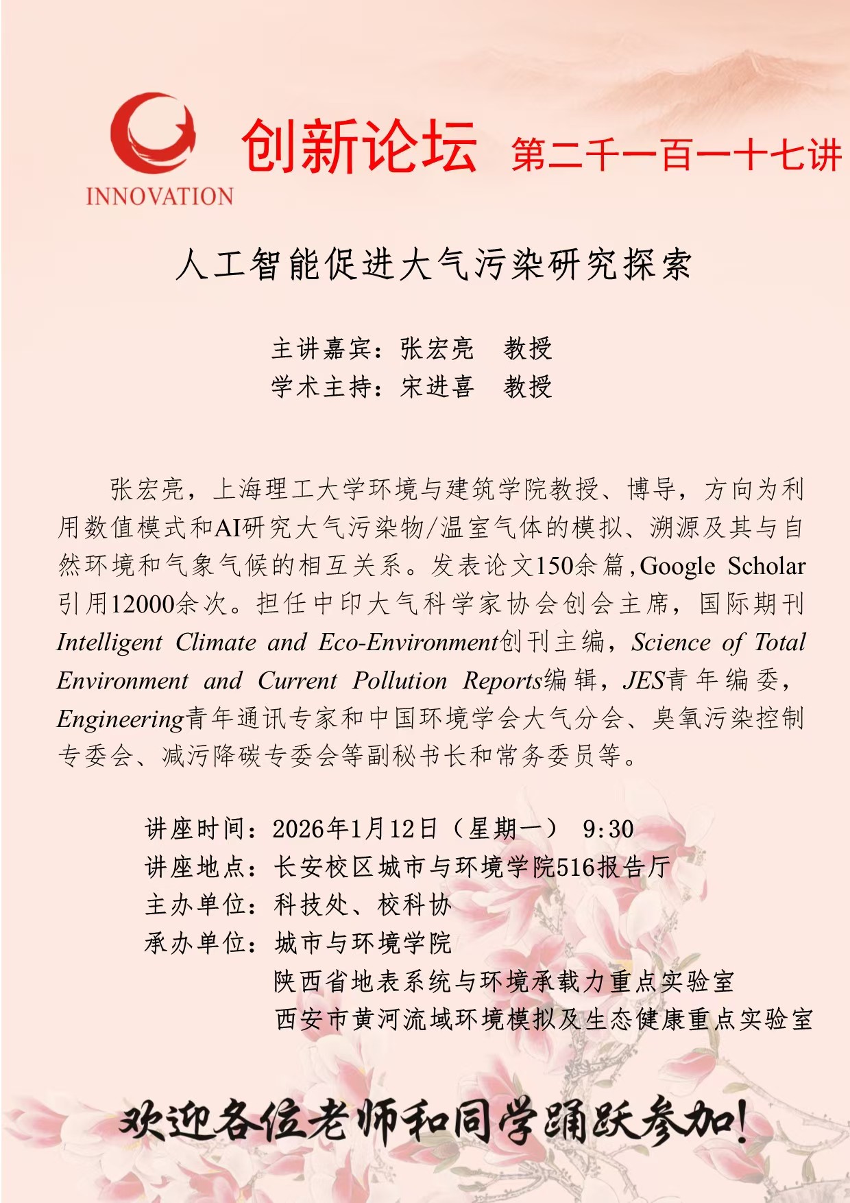 张宏亮 教授 伟德国际1946源于英国创新论坛第二千一百一十七讲:人工智能促进大气污染研究探索 讲座时间 2026年1月12日(星期一) 9:30 讲座地点 长安校区城市与环境学院516报告厅 讲座人介绍 张宏亮 教授 讲座内容