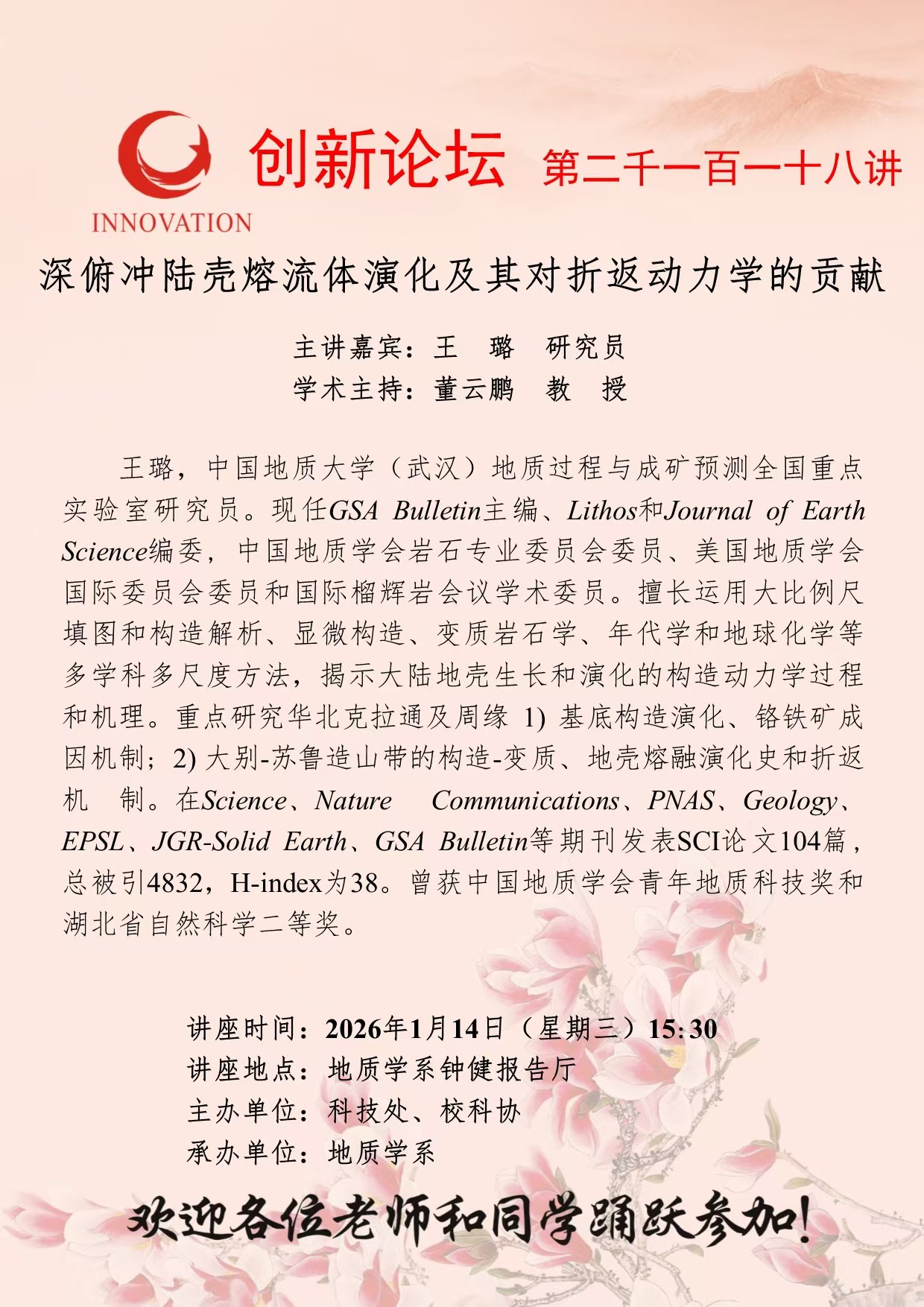 王 璐 研究员 伟德国际1946源于英国创新论坛第二千一百一十八讲:深俯冲陆壳熔流体演化及其对折返动力学的贡献 讲座时间 2026年1月14日(星期三)15:30 讲座地点 地质学系钟健报告厅 讲座人介绍 王 璐 研究员 讲座内容